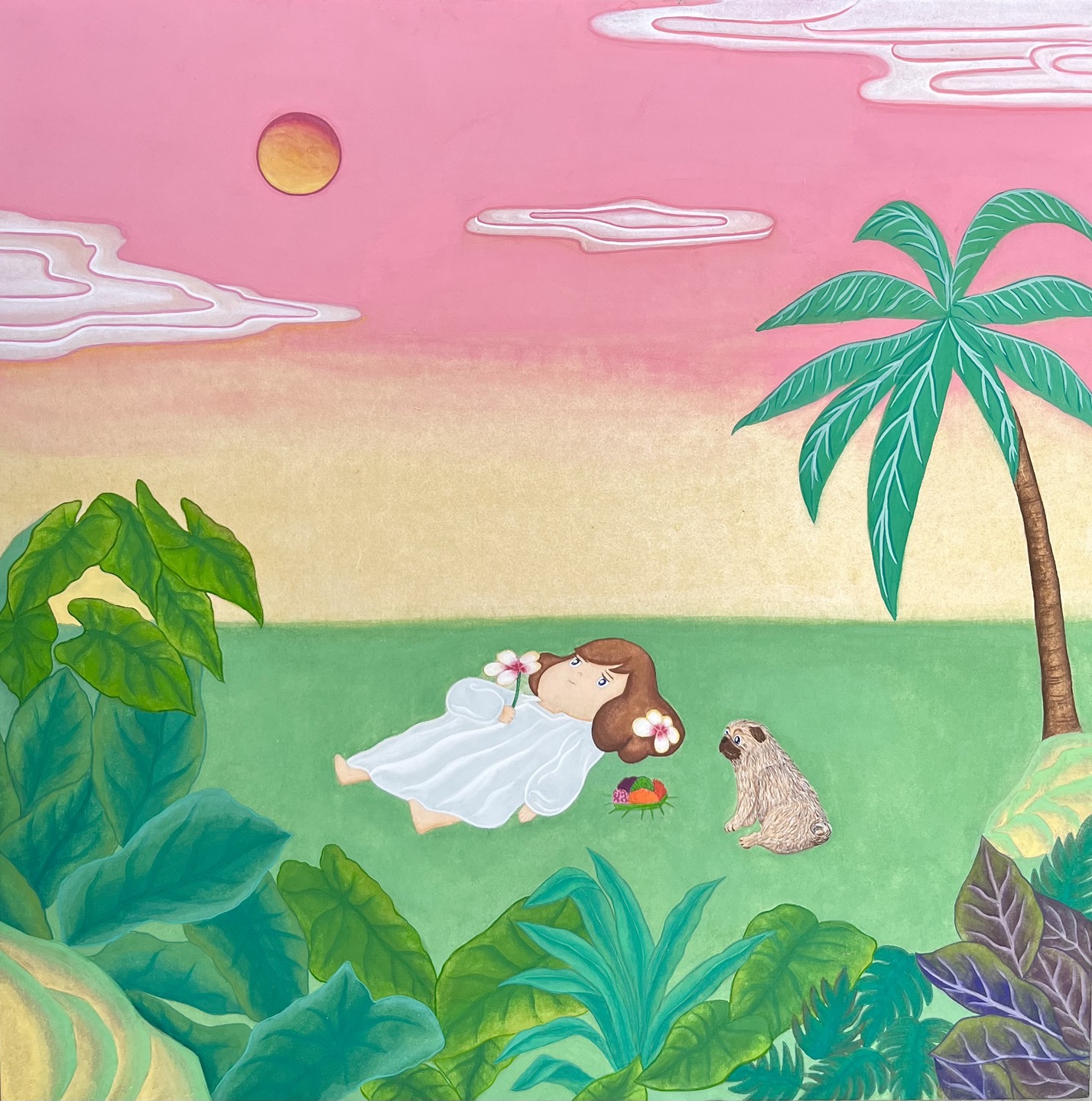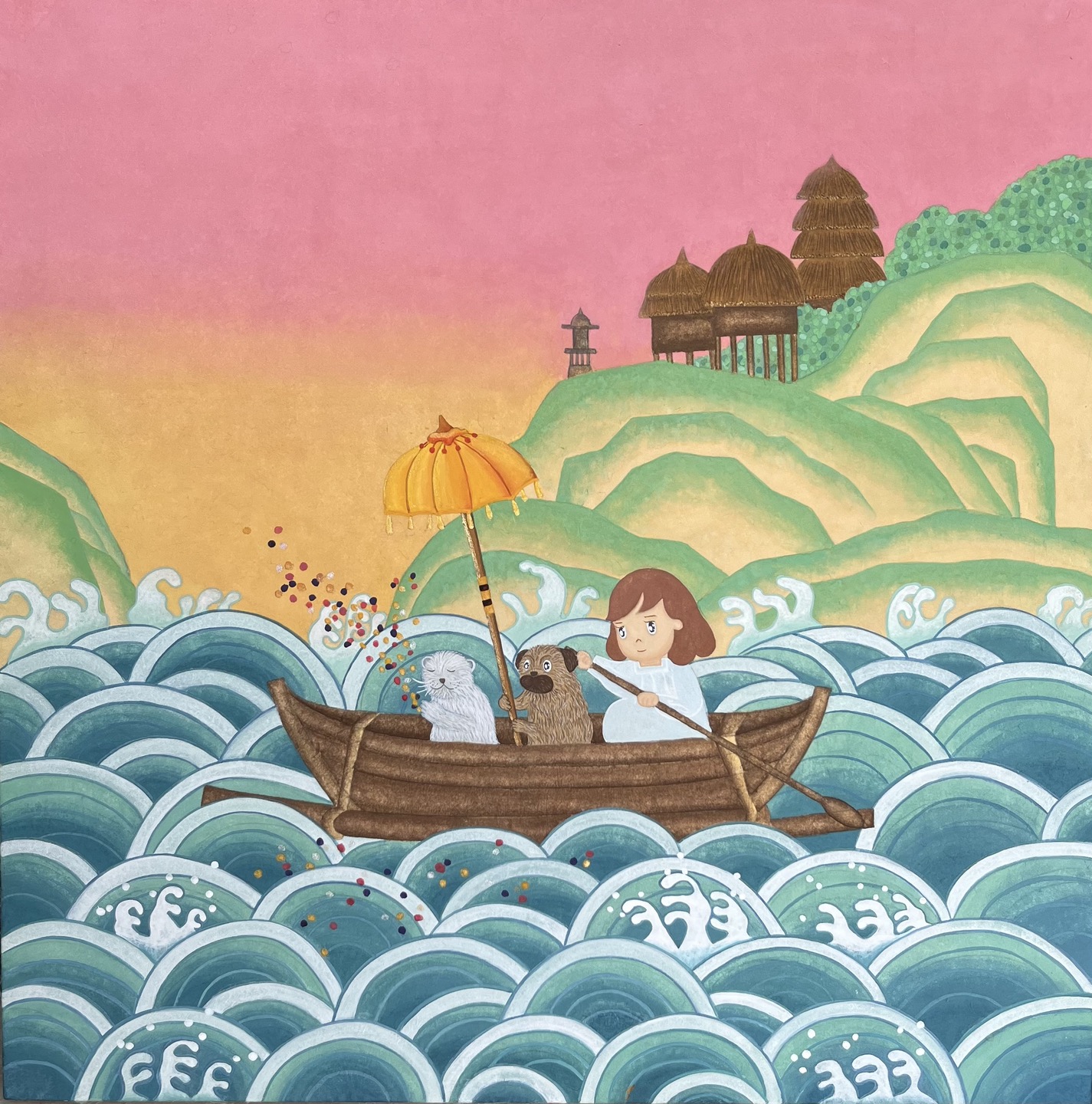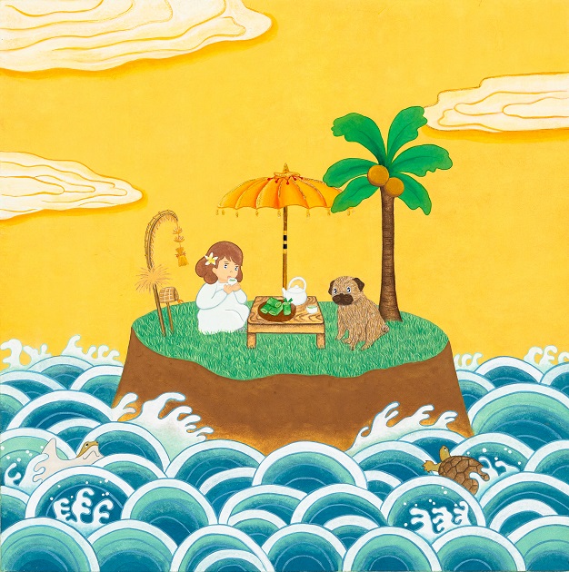 발리의 선셋아래 페코와 함께 Peko and me under Sunset in Bali! 38 x 38cm 한지에 채색 2023