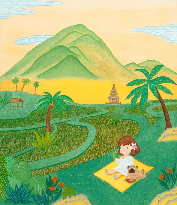 발리의 전통문화를 한국적으로 표현한 ‘Daisy Park 데이지 박’ 작가의 작품은 발리의 일상에서 본 느낌들이 고스란히 묻어있습니다. 한국화 속에 녜삐데이의 고요함과 평온이 사랑스럽게 담겨 새들과 곤충들이 노는 소리를 들으며 은하수가 흘러가는 모양들을 고요히 바라봅니다. 사랑스러운 마음으로 공을 들인 데이지 박 Daisy Park 작가님의 작품 속에서 반짝이는 별들과 구름의 소리가 평온하게 들립니다.