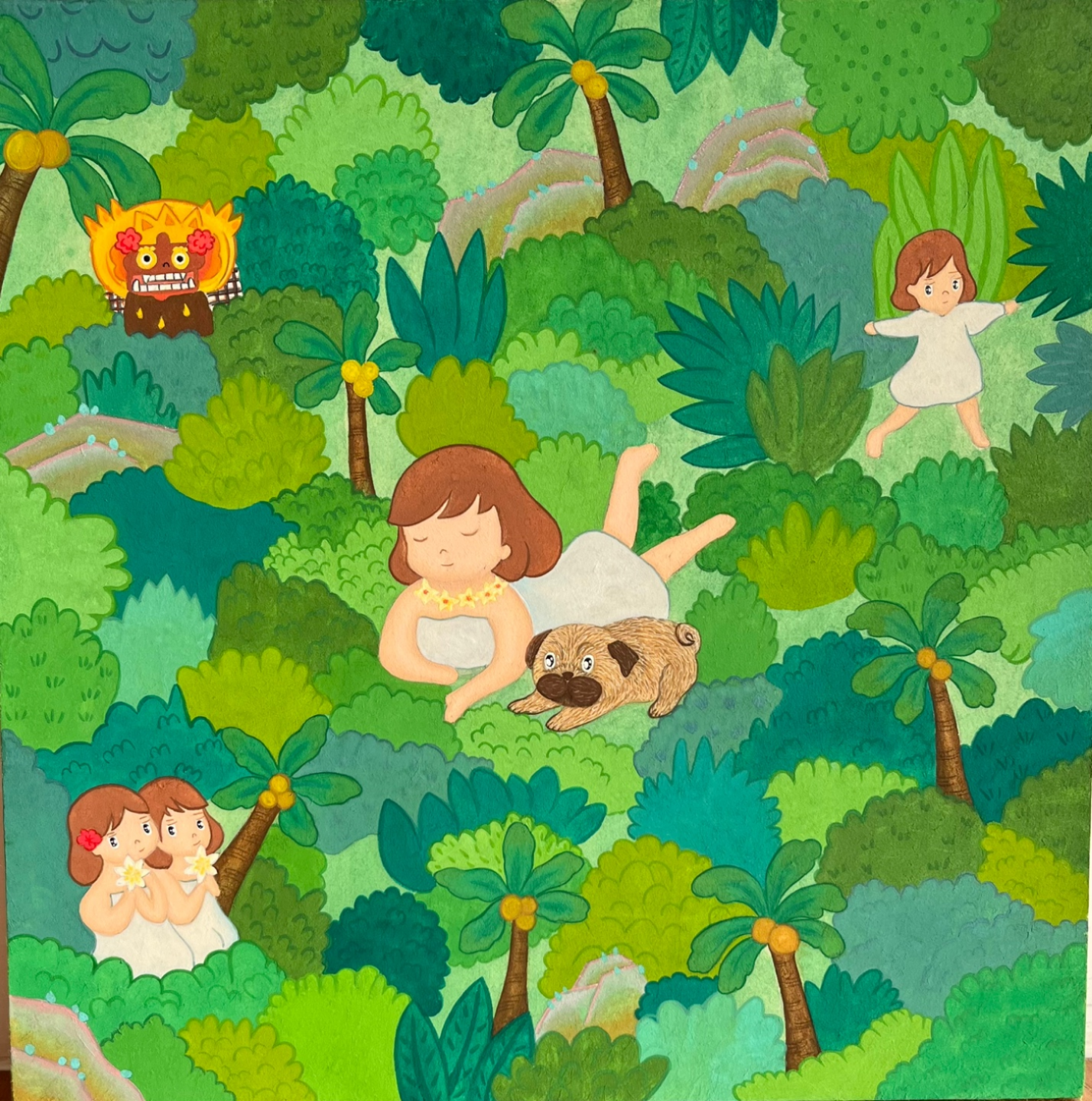 발리니즈 민화에서 깨알처럼 그린 나무들과 사람들을 원근법없이 만화처럼 그린것이 생각났고 내가 느낀대로 그려보고 싶었습니다.
