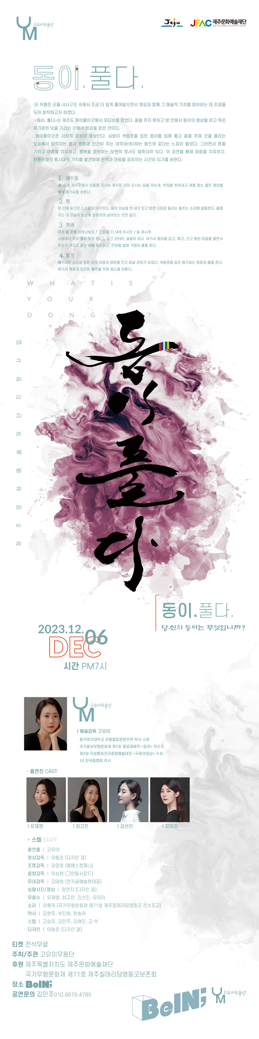 공연설명: 과거 굿이 마음을 치유하고 안정을 찾는 수단으로 사용되었듯 현시대의 키워드인 힐링이 이번 공연을 통해 현장에 공유되고 느껴지길 바라면서 춤과 미디어아트의 결합으로 이루어진 작품.