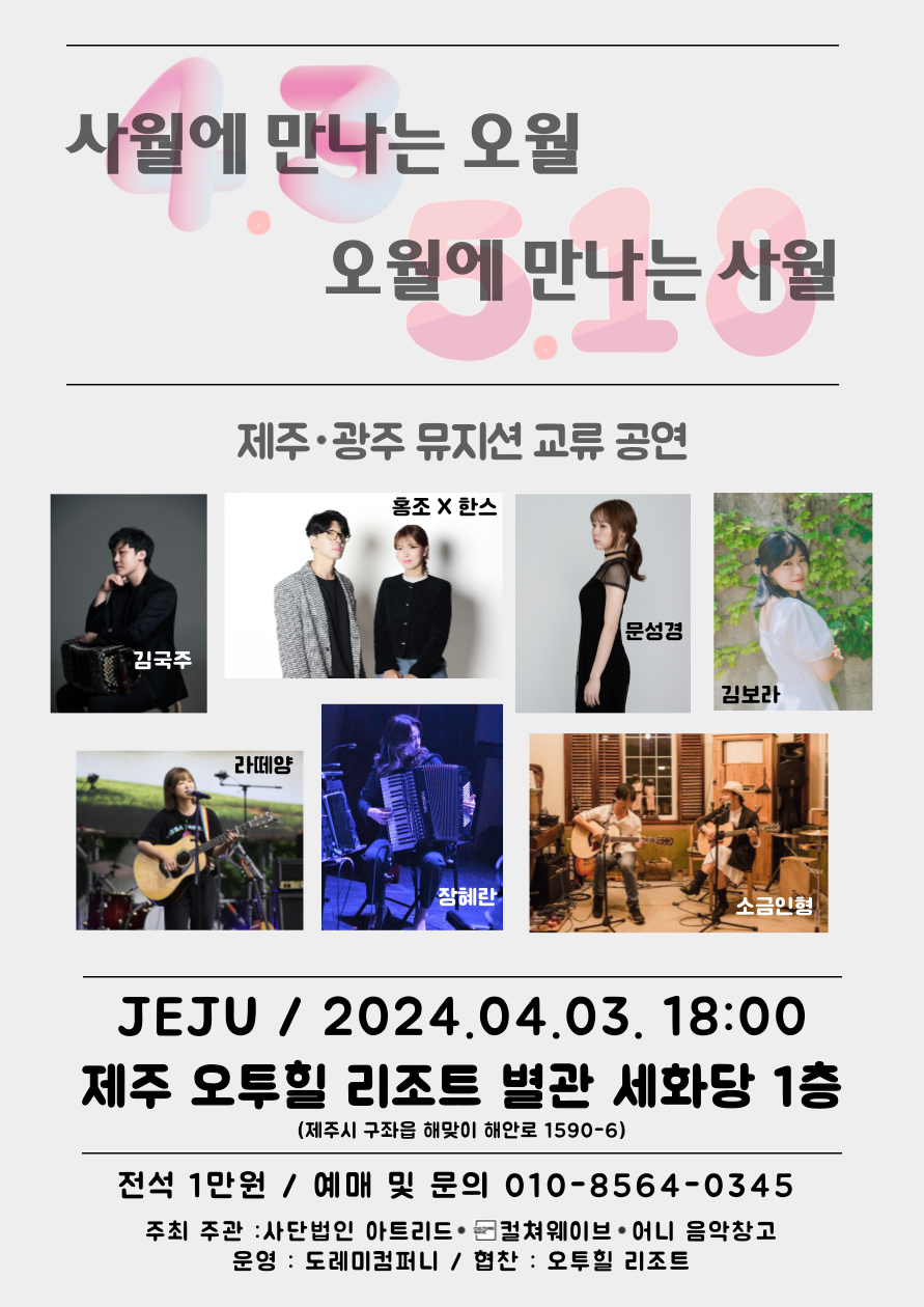 ㈔아트리드, 컬쳐웨이브, 어니 음악창고가 공동 주최하고, 도레미컴퍼니 주관으로 열리는 ‘사월에 만나는 오월, 오월에 만나는 사월’ 제주 광주 뮤지션 교류 공연이 다음 달 3일 제주시 구좌읍 오투힐 리조트 별관 세화당에서 열린다. 5월 24일에는 광주 5·18민주광장에서 마련된다.