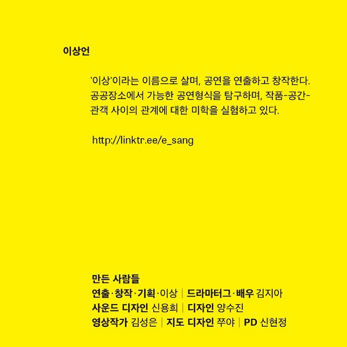 관객은 먼저 자리를 떠난 사운드의 존재를 찾아가는 과정에서 자신에게 익숙했던 도시를 낯설게 여행하고, 최종 장소에 도착하여서는 또 다른 이야기들을 발견하게 되면서 부재와 존재의 개념에 대해 감각하고, 사유하는 시간으로 초대됩니다.