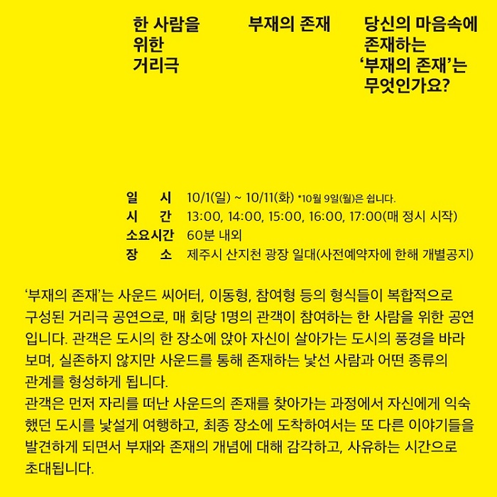부재의 존재는 사운드 씨어터, 이동형, 참여형 동의 형식들이 복합적으로 구성된 거리극 공연으로, 매 회당 1명의 관객이 참여하는 한 사람을 위한 공연입니다. 관객은 도시의 한 장소에 앉아 자신이 살아가는 도시의 풍경을 바라보며, 실존하지 않지만 사운드를 통해 존재하는 낯선 사람과 어떤 종류의 관계를 형성하게 됩니다.