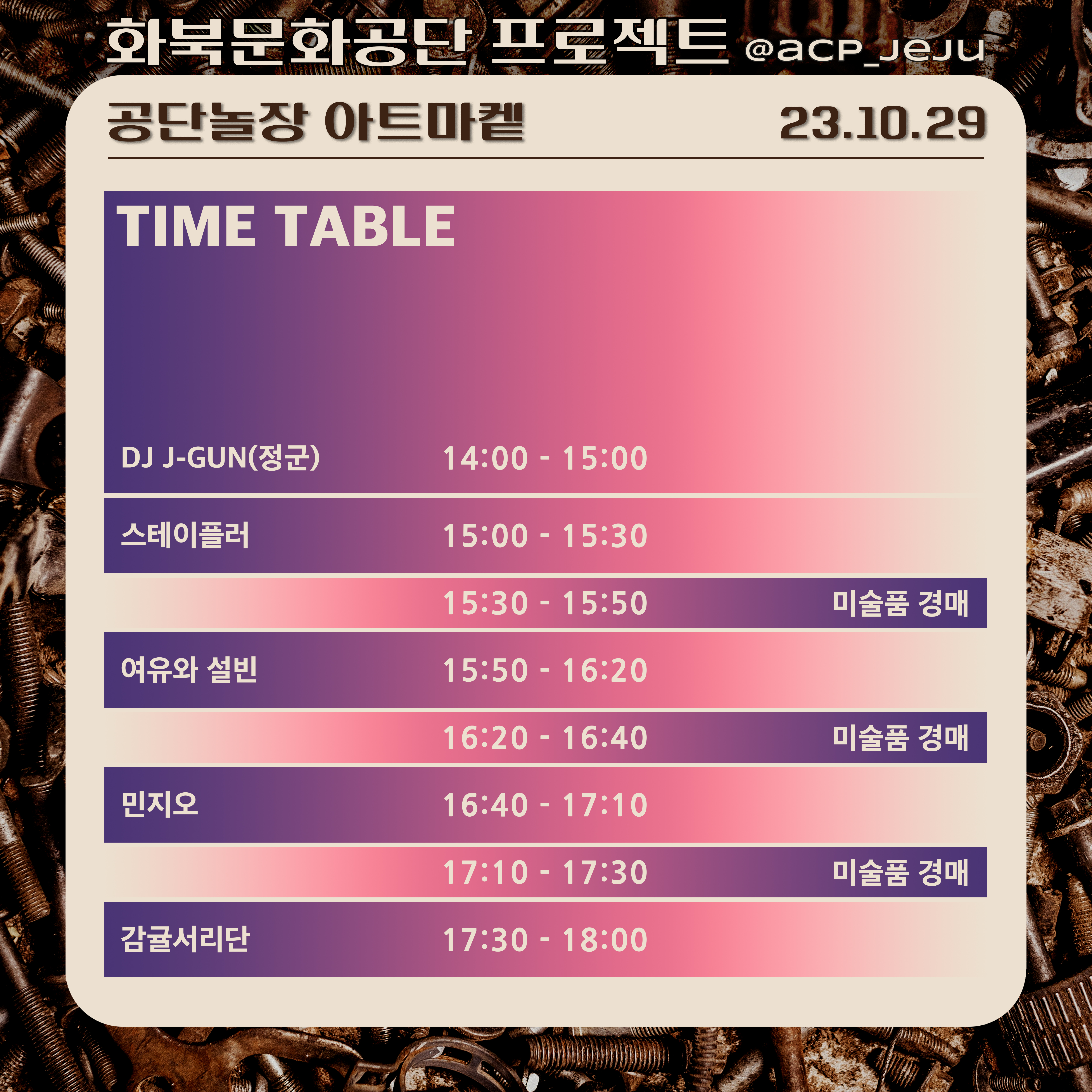 10월 14일 제주 청년 작가 3인 라군선, 박주우, 오지우 의 STARTING POINT 전시를 시작으로 29일 마지막 날에는 DJ-JUN(정군), 스테이플러, Minzio(민지오), 여유와설빈, 감귤서리단의 라이브 공연과 미술품 경매가 결합된 페스티벌 형태의 공연‘공단놀장 아트마켙’을 준비했습니다. 더불어 시민참여 프로그램 ‘공단의 낮과 밤’은 사진 공모 이벤트 등으로 화북공업단지가 문화예술 활동으로 채워집니다.