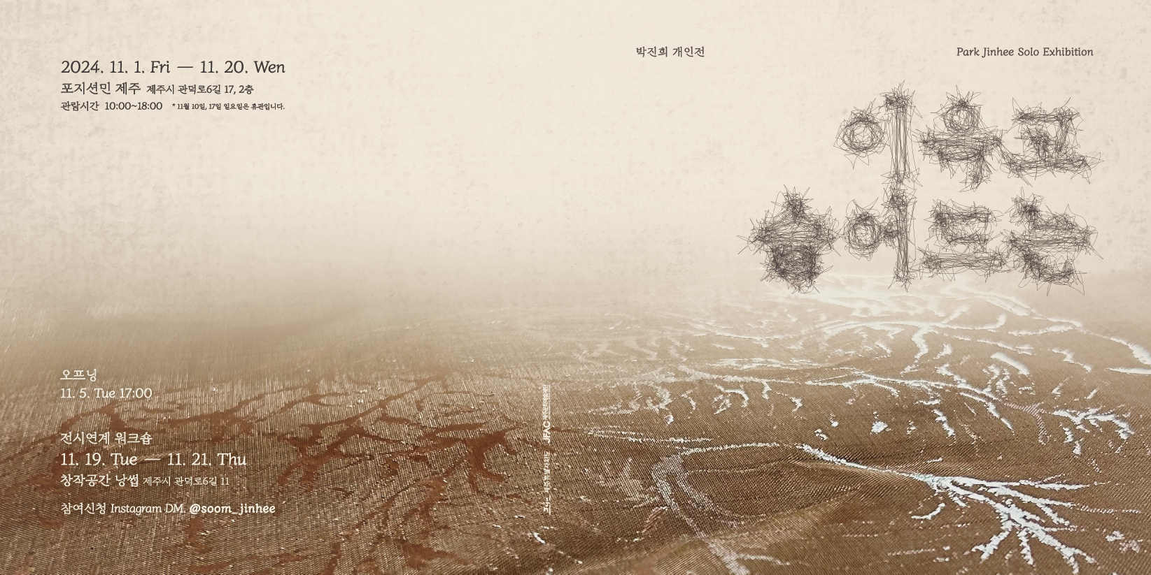 박진희 개인전 이윽고 슬어드는 전시는 11월1일부터 20일가지 포지션민제주에서 열린다. 이번전시는 여성들의 노동과 돌봄의 삶의 메세지를 어머니들의 삶을 상징화하여 동망이라는 금속과 바닷물이라는 자연물이 만다 병화ㅘ는 시간을 조형적으로 드러내는 전시이다.