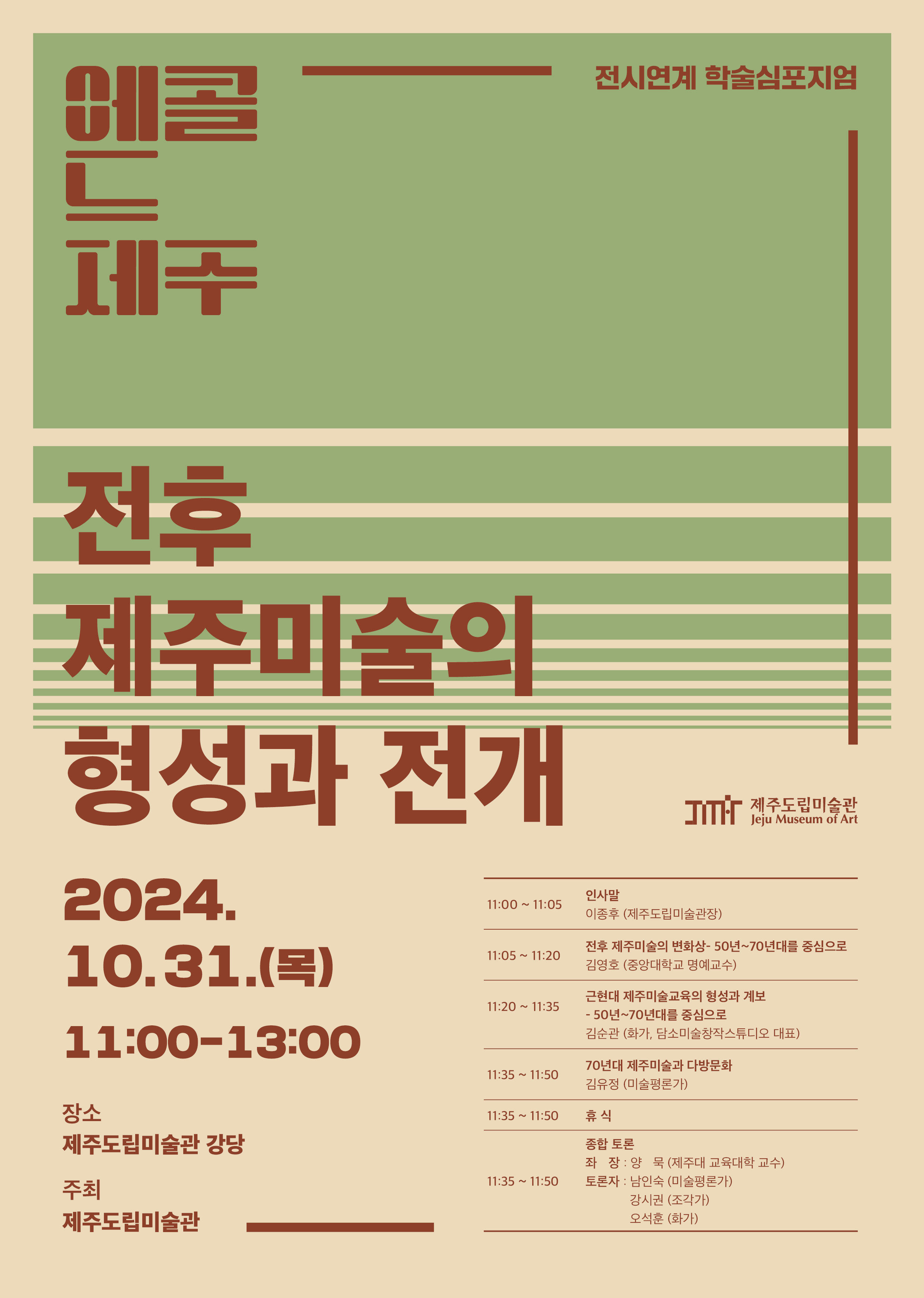 - 연구발표: 근현대 제주미술 교육의 형성과 계보(김순관 화가), 70년대 제주미술과 다방문화(김유정 미술평론가)