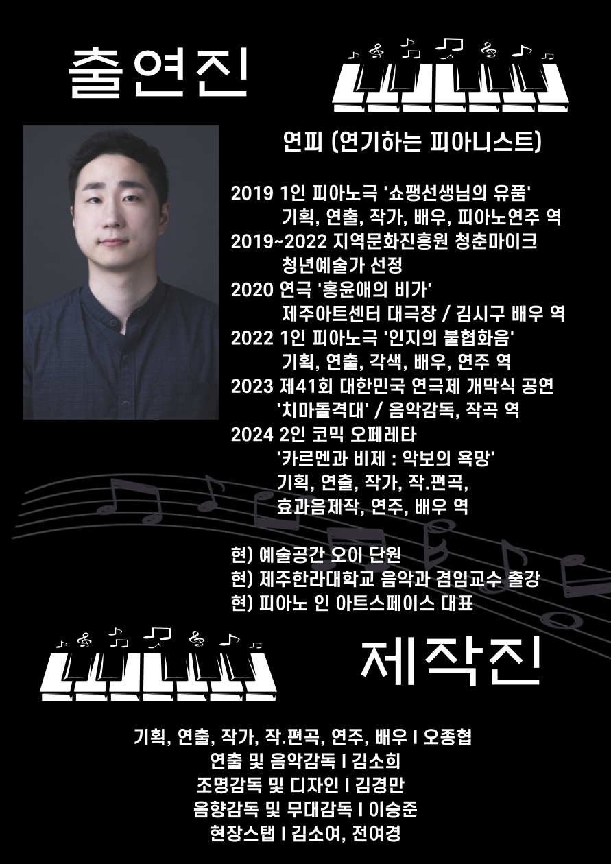 피아노 인 아트스페이스 , 1 기획/연출/작가/작.편곡/연주/배우 오종협 2 연출 김소희 3 조명감독 및 디자인 김경만 4 음향감독 및 무대감독 이승준 5 현장스탭 김소여 6 현장스탭 전여경