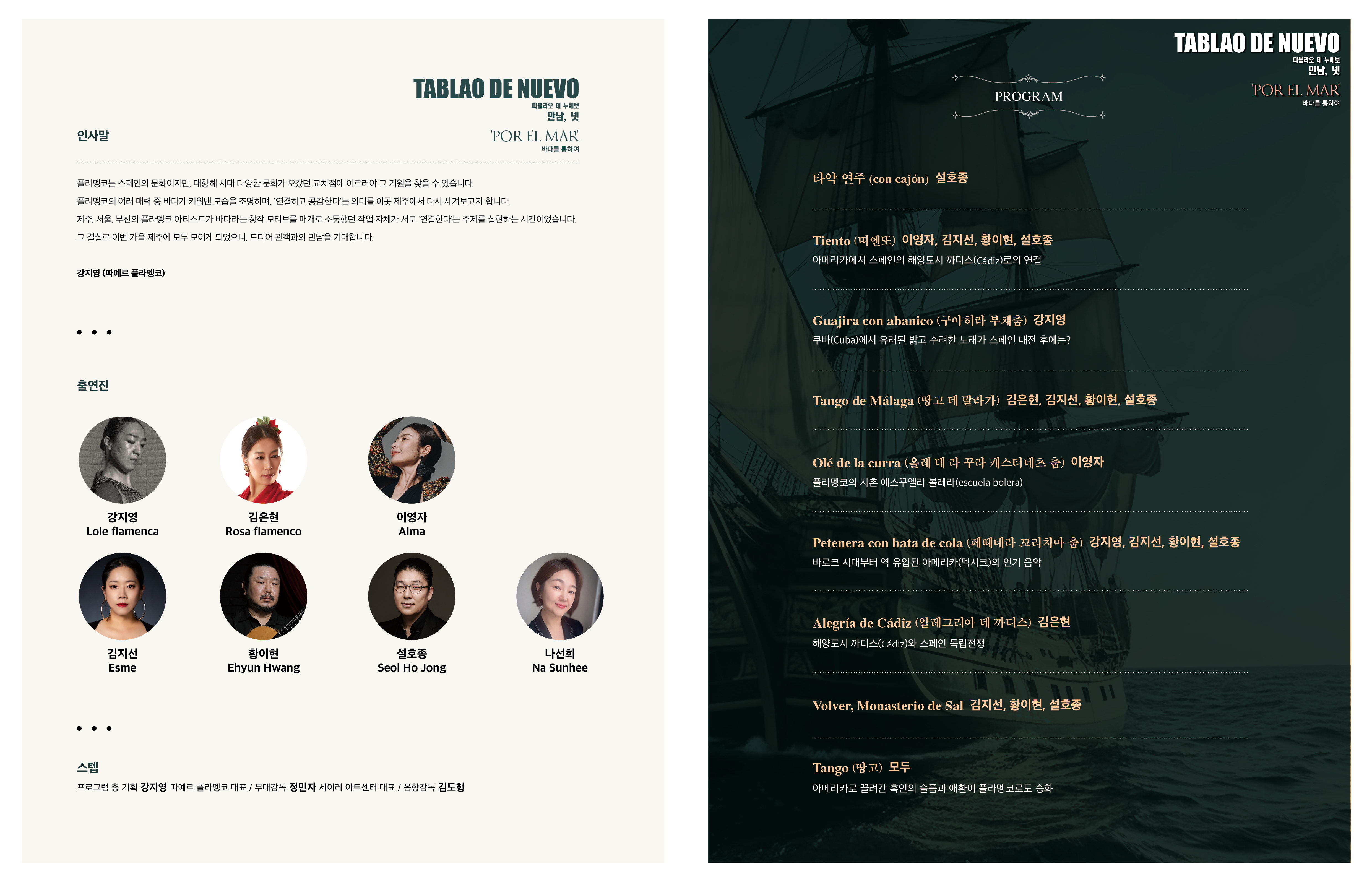 플라멩코는 스페인의 문화이지만, 대항해 시대 다양한 문화가 오갔던 교차점에 이르러야 그 기원을 찾을 수 있습니다. 플라멩코의 여러 매력 중 바다가 키워낸 모습을 조명하며, '연결하고 공감한다'는 의미를 이곳 제주에서 다시 새겨보고자 합니다.