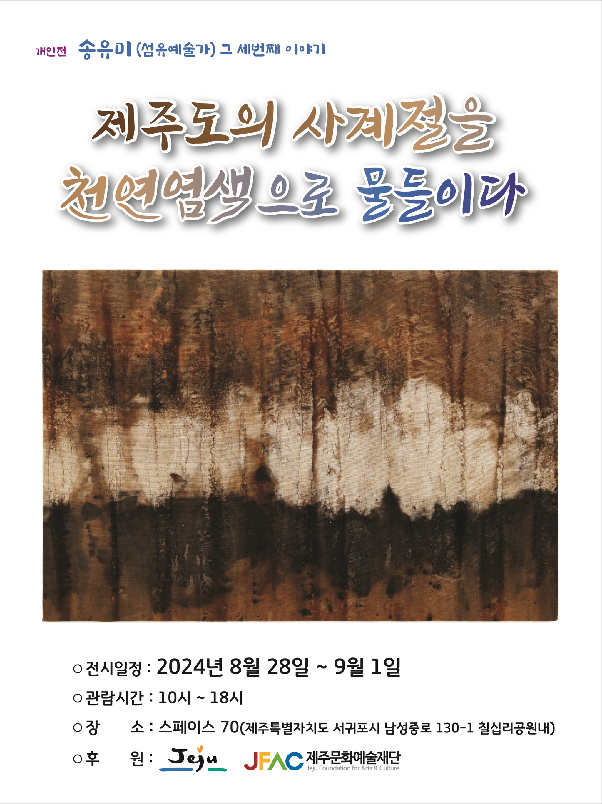 봄에 익어가는 가파도 보리, 늘 푸르른 바당이 있는 사계 해변과 송악산의 여름, 산방산의 가을, 그리고 1100고지의 겨울을 천연염색으로 표현한 작품들을 전시하고 있습니다.