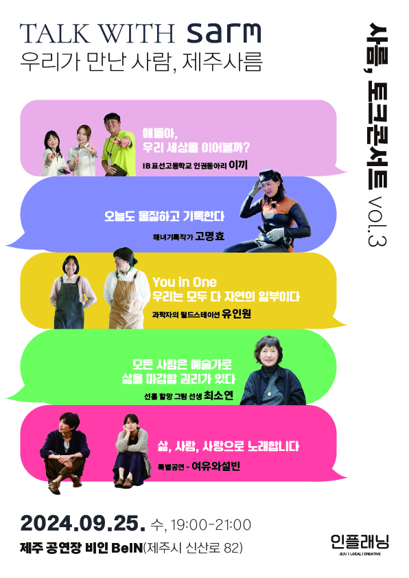 사름 토크콘서트는 매거진 사름sarm을 만드는 인플래닝에서 직접 기획, 운영하는 프로그램입니다. 다양한 삶의 모습을 통해 청중에게 위로와 공감을 전하며, 인플래닝의 사름 프로젝트는 각자의 분야에서 노력하는 모든 이들, 서로 다른 우리가 지속적으로 대화하며 건강한 연대가 확산되기를 기대합니다.