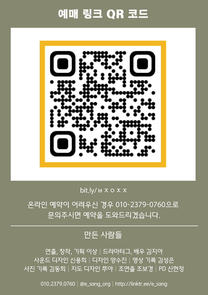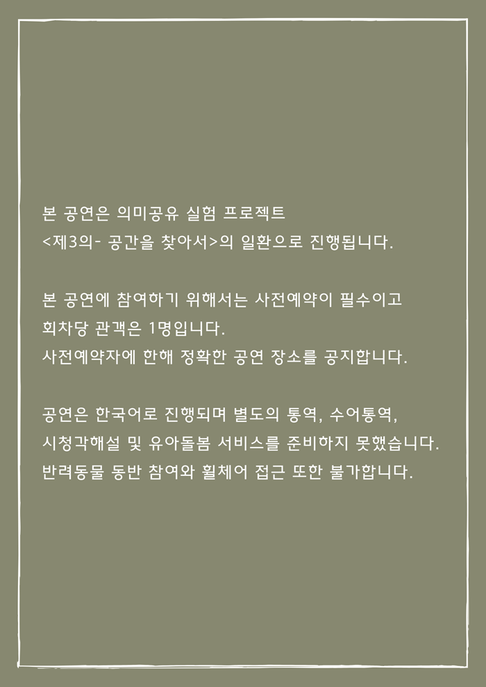 * 본 공연에 참여하기 위해서는 사전예약이 필수입니다. 회당 관객은 1명으로 한정됩니다. http://bit.ly/ㅂㅈㅇㅈㅈ