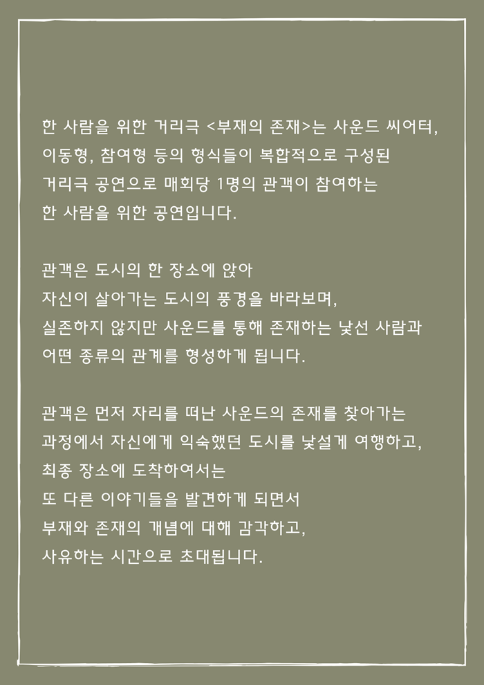 부재의 존재는 사운드 씨어터, 이동형, 참여형 등의 형식들이 복합적으로 구성된 거리극 공연으로, 매 회당 1명의 관객이 참여하는 한 사람을 위한 공연입니다. 관객은 도시의 한 장소에 앉아 자신이 살아가는 도시의 풍경을 바라보며, 실존하지 않지만 사운드를 통해 존재하는 낯선 사람과 어떤 종류의 관계를 형성하게 됩니다.