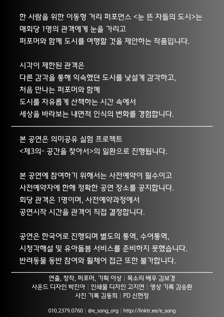 이동형 거리 퍼포먼스 <눈 뜬 자들의 도시>는 매회당 1명의 관객에게 눈을 가리고 인도자와 함께 도시를 여행할 것을 제안하는 작품입니다. 시각이 제한된 관객은 다른 감각을 통해 익숙했던 도시를 낯설게 감각하고, 처음 만나는 인도자와 함께 도시를 자유롭게 산책하는 시간 속에서 세상을 바라보는 내면적 인식의 변화를 경험합니다.
