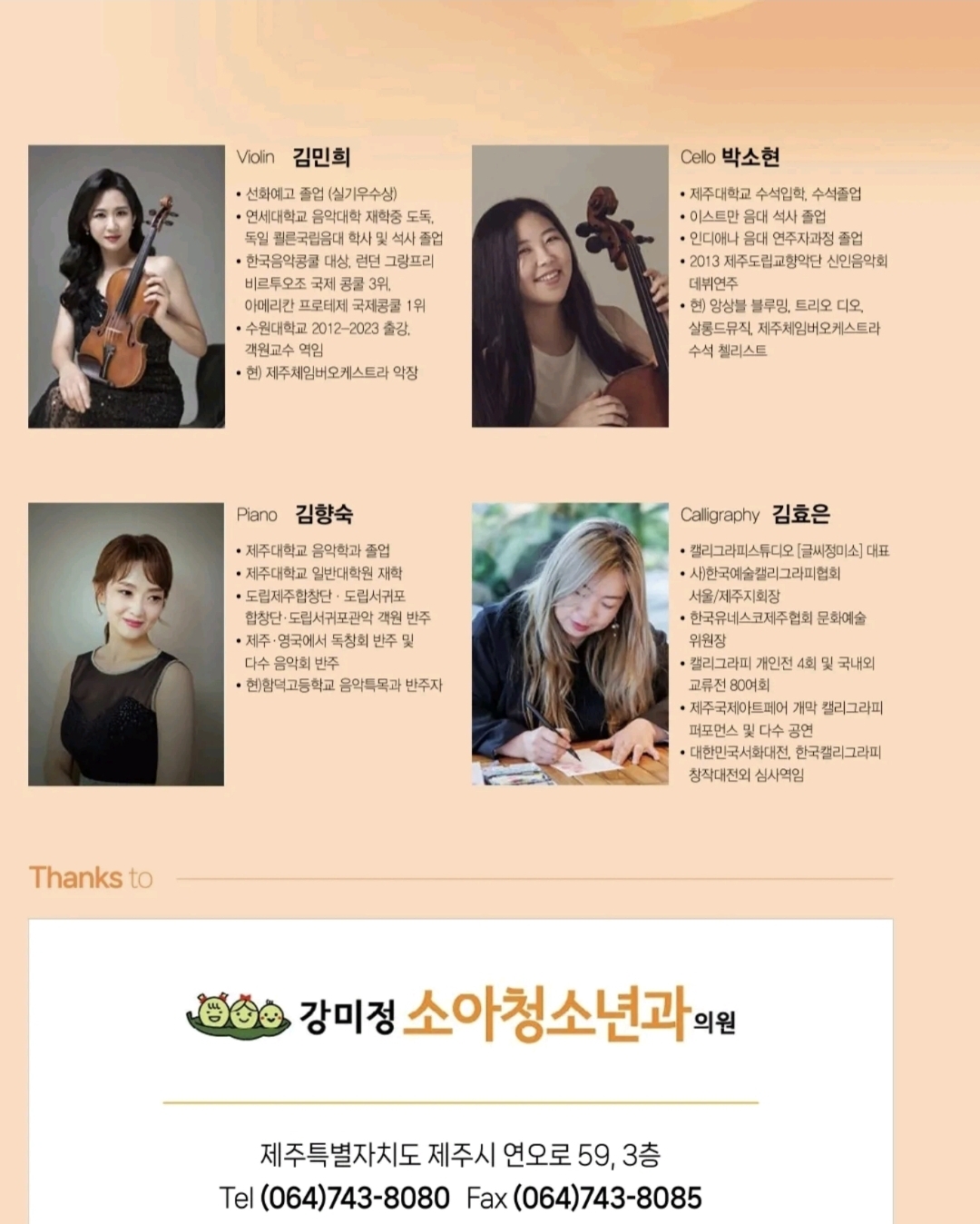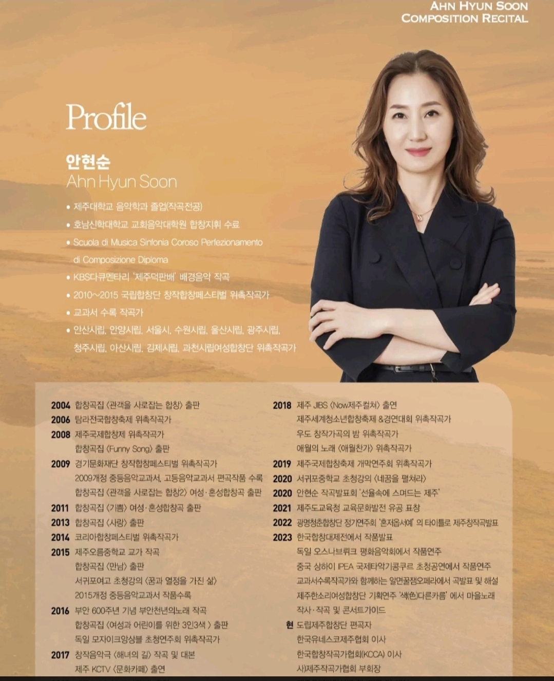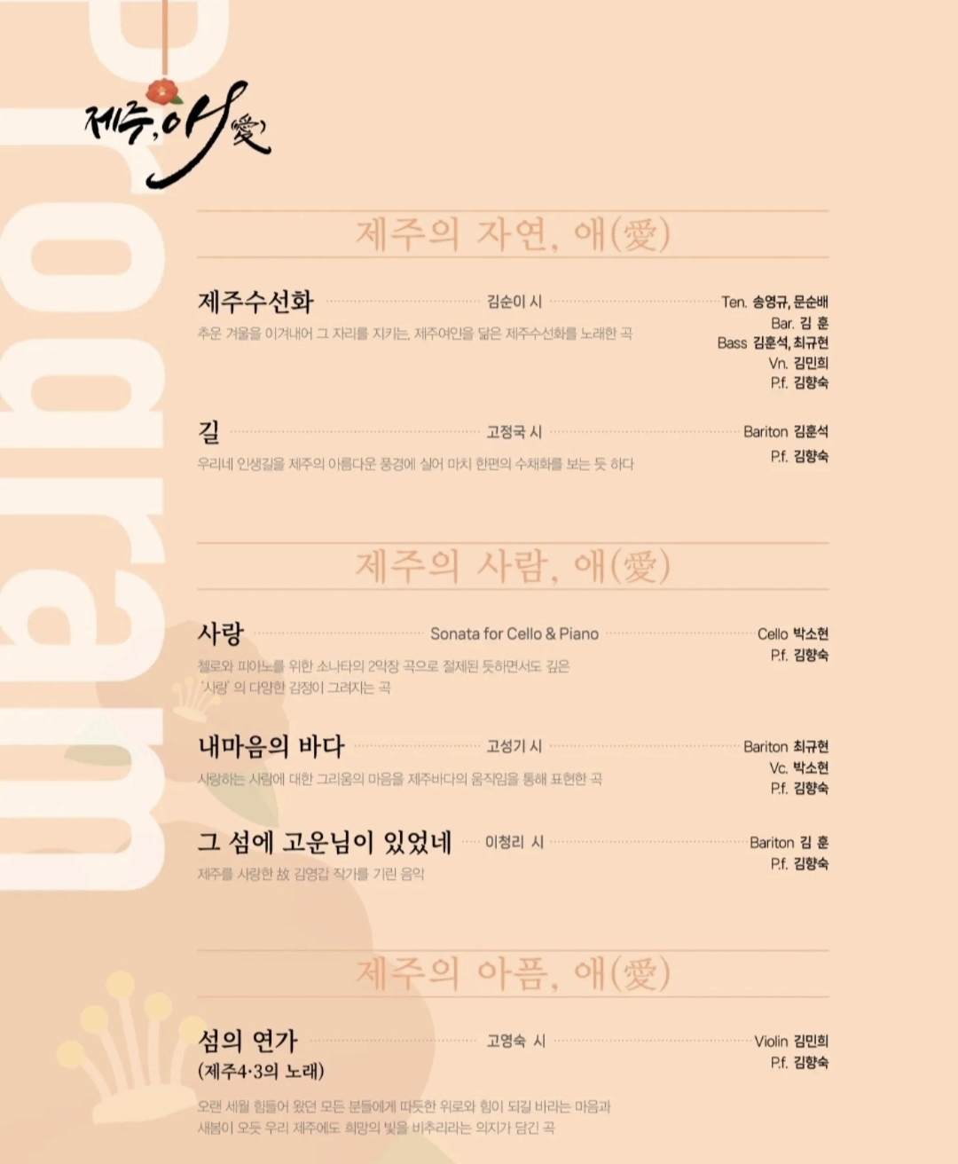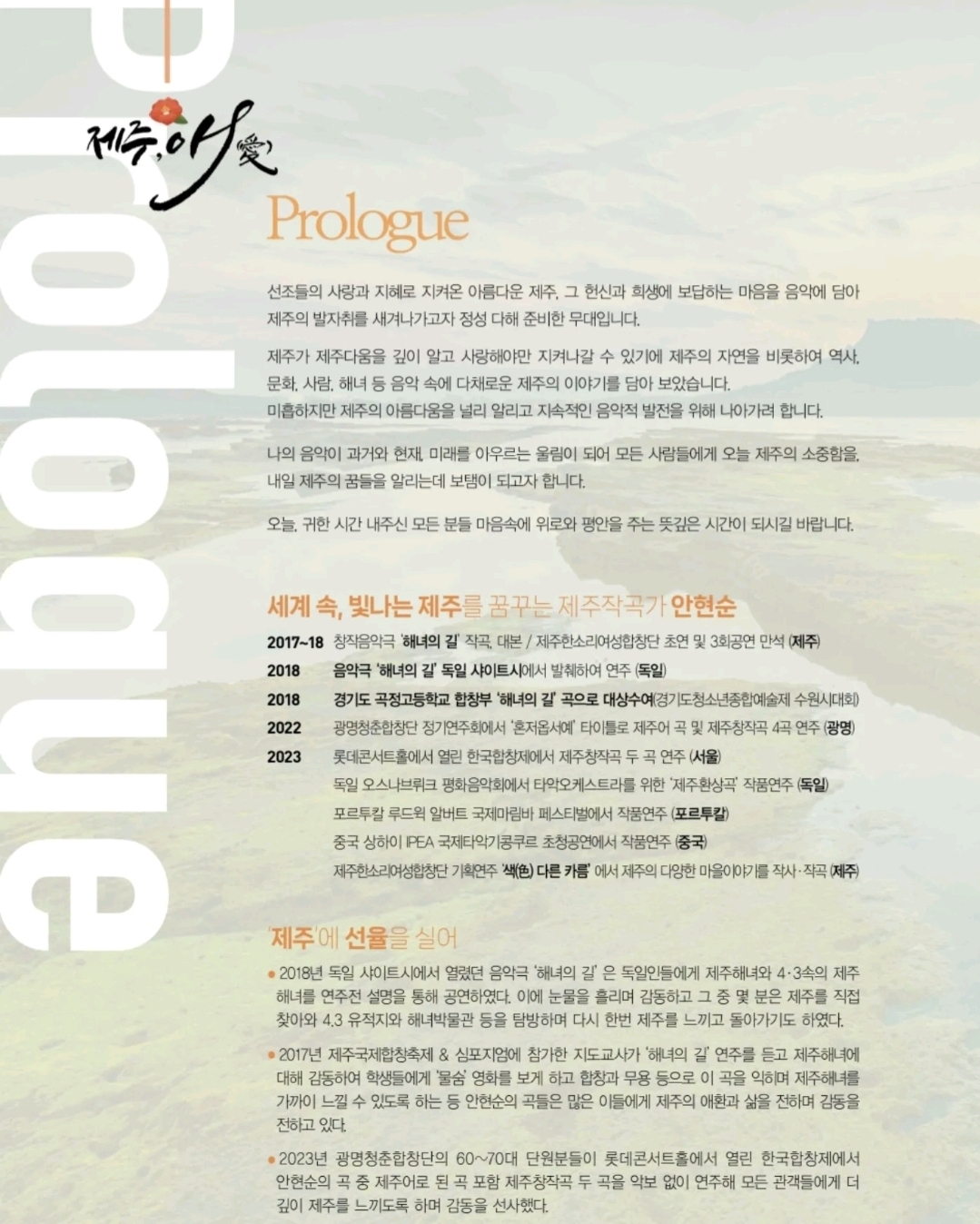제2회 안현순 작곡발표회 '제주,애愛' 는 제주의자연, 제주의 사람, 제주의아픔(제주4.3), 해녀문화, 제주의 부부까지 다양한 이야기들이 담겨있는 제주시인의 시에 선율을 실어 음악으로 표현된 곡을 만나게 되는 무대입니다. 남성 성악가들의 솔로와 앙상블의 웅장하고도 감미로운 울림을, 바이올린과 첼로의 풍성한 화음으로 듣게되는 제주해녀정신인 '공생' 의 풍부한 울림과 곡의 분위기에 맞는 캘리그라피 영상까지 제주를 진하게 느낄 수 있을 것입니다. 선조들의 희생과 헌신으로 지켜온 제주, 그 감사의 마음을 음악에 담아 연주를 통해 제주의 소중함을 깨닫게 되기를, 깊은 사랑을 느낄 수 있는 귀한 시간이 되기를 바라며 공연을 준비했습니다.
