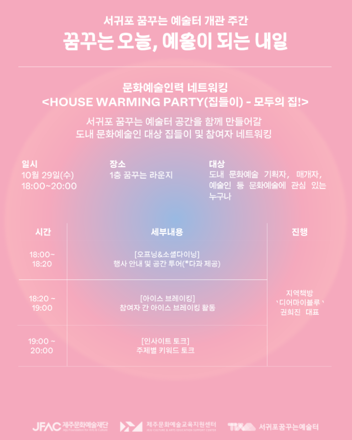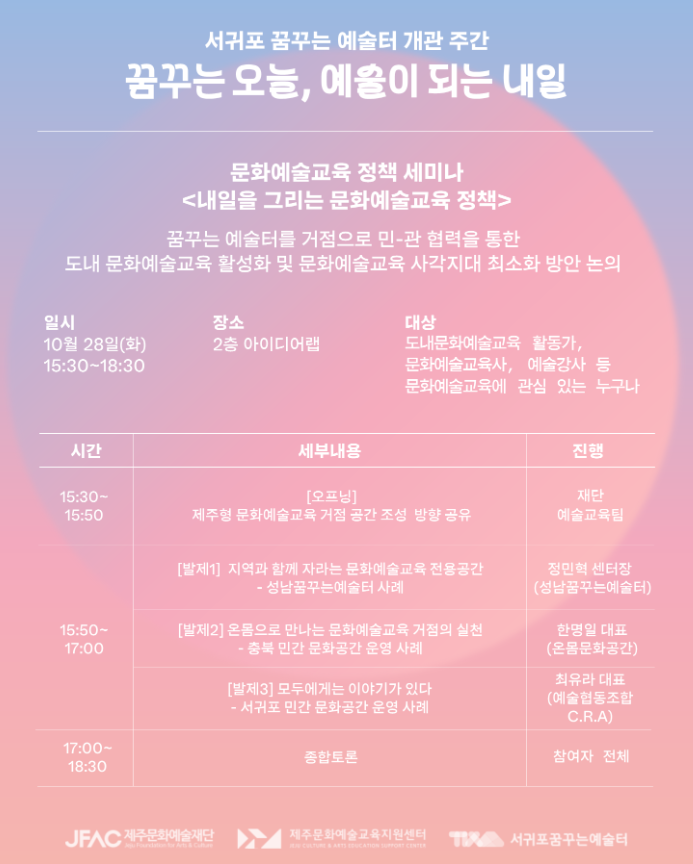 공간의 비전과 정체성을 알리기 위해 ‘서귀포 꿈꾸는 예술터 개관 주간’ 행사를 개최합니다.