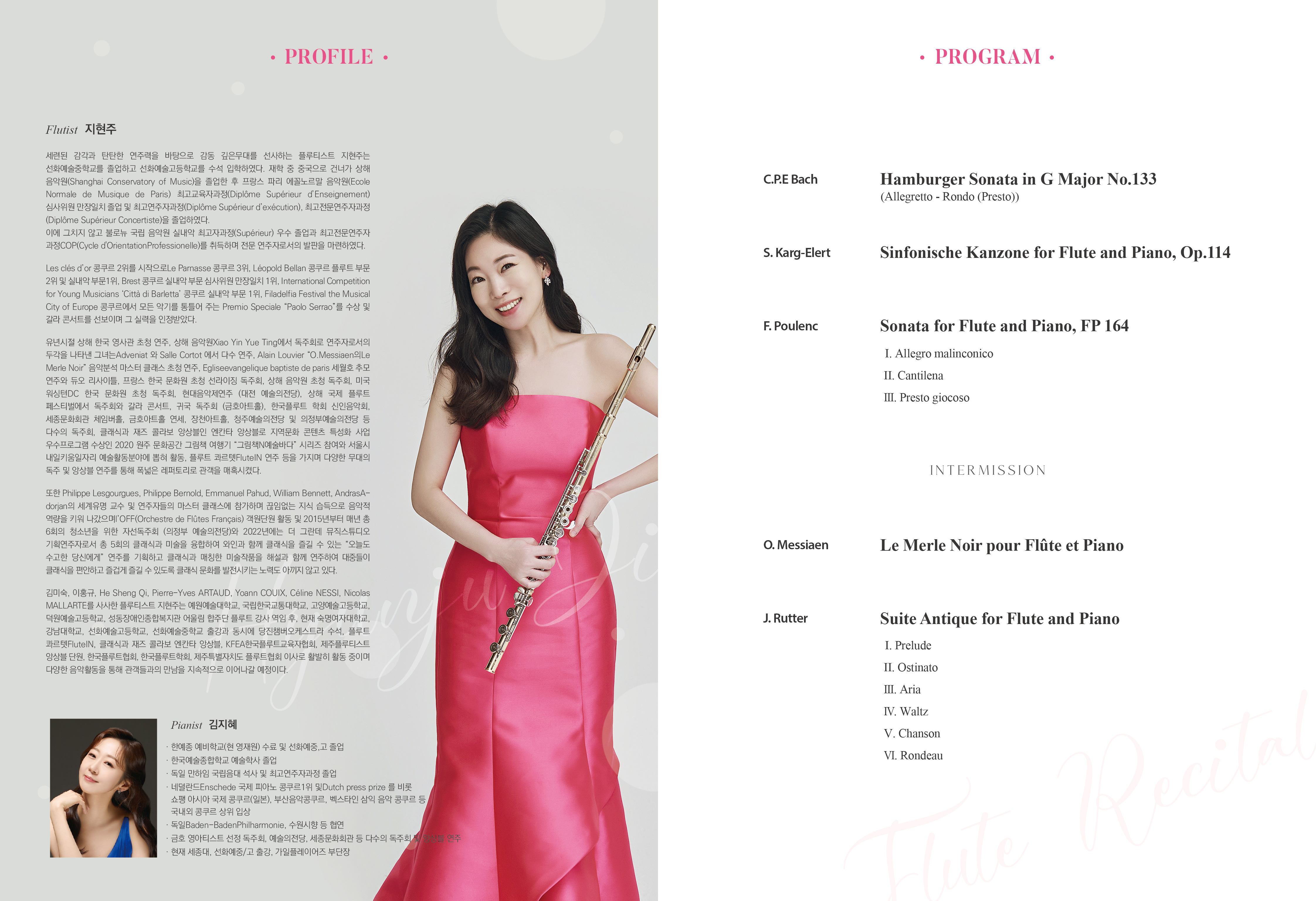 김미숙, 이홍규, He Sheng Qi, Pierre-Yves ARTAUD, Yoann COUIX, Céline NESSI, Nicolas MALLARTE 를 사사한 플루티스트 지현주는 예원예술대학교, 국립한국교통대학교, 고양예술고등학교, 덕원예술고등학교, 성동장애인종합복지관 어울림 합주단 플루트 강사 역임 후, 현재 숙명여자대학교, 강남대학교, 선화예술고등학교, 선화예술중학교 출강과 동시에 당진챔버오케스트라 수석, 플루트 콰르텟 FluteIN, 클래식과 재즈 콜라보 엔칸타 앙상블, KFEA한국플루트교육자협회, 제주플루티스트 앙상블 단원, 한국플루트협회, 한국플루트학회, 제주특별자치도플루트협회 이사로 활발히 활동 중이며 다양한 음악활동을 통해 관객들과의 만남을 지속적으로 이어나갈 예정이다.