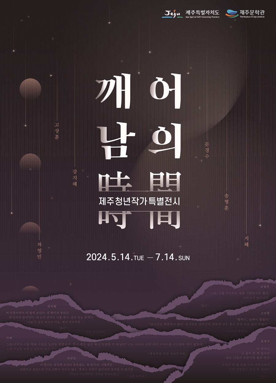 제주문학관 청년 작가 특별전 '깨어남의 시간'은 제주를 기반으로 활동하는 청년 작가들을 조명하는 첫 번째 전시입니다. 전시 '깨어남의 시간'은 작가들의 작품이 독자를 만나게 되기까지의 과정을 '밤'과 '깨어남'으로 표현하였습니다. 밤은 고통과 고뇌의 시간이지만, 이 시간이 지나야 잠에서 깰 수 있습니다. 하나의 작품도 밤의 시간이 지나고 잠에서 깨어나듯, 수많은 고뇌의 시간이 지나고 탄생합니다. 이번 전시를 통해 작가의 '밤과 깨어남의 시간'을 함께 걸어보는 계기가 되길 바랍니다.
