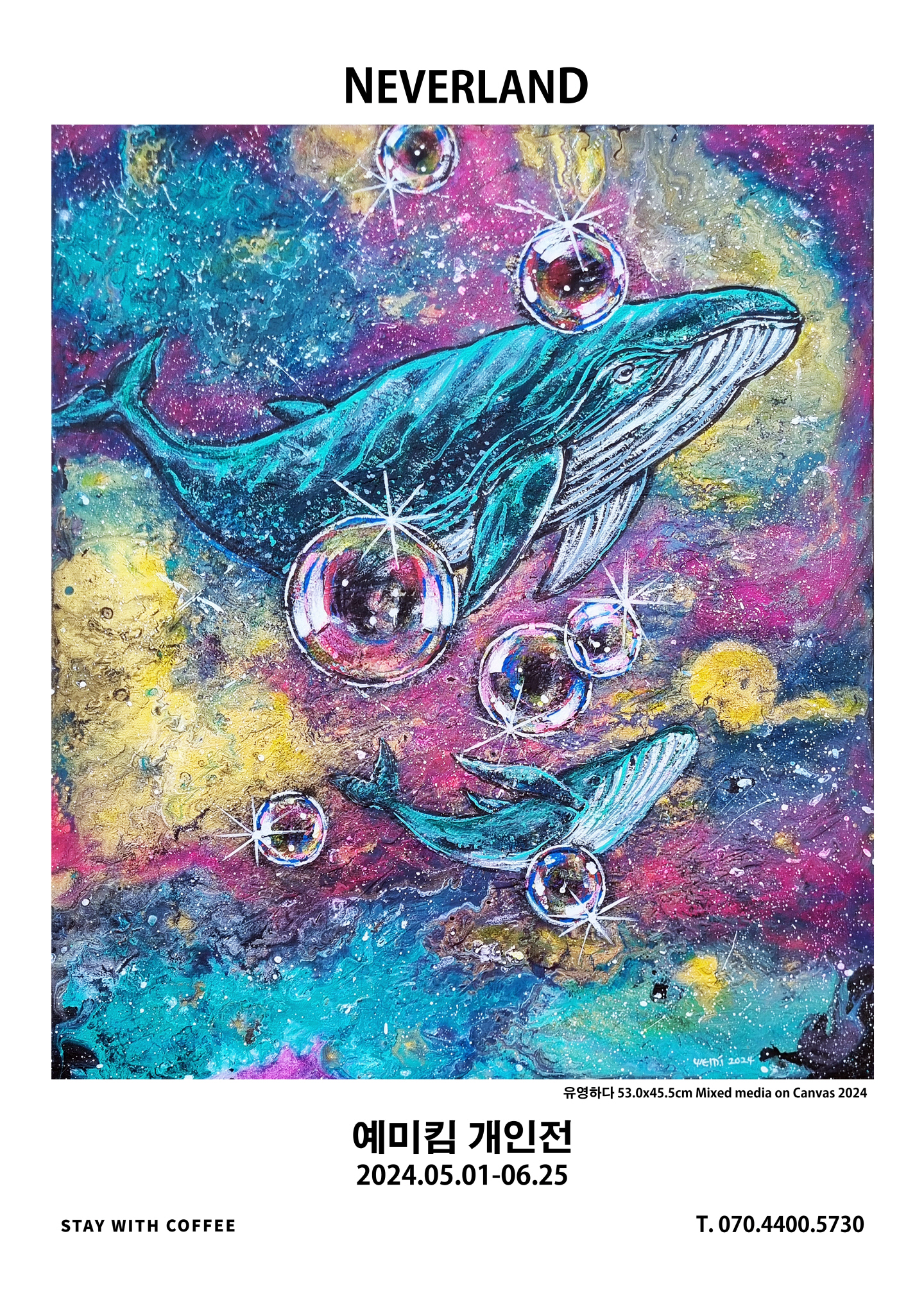 대관 공모전에 선정되어 열리는 이번 전시에서 예미킴 작가는 소설 피터팬에 나오는 네버랜드를 모티브로한 회화작품들을 선보인다. 작품에는 작고 무해한 소시민을 대변하는 토끼요정, 마찬가지로 거대하지만 순수하고 춤과 노래, 여행을 좋아하는 고래, 이들을 지켜보는 별과 비눗방울이 등장한다.