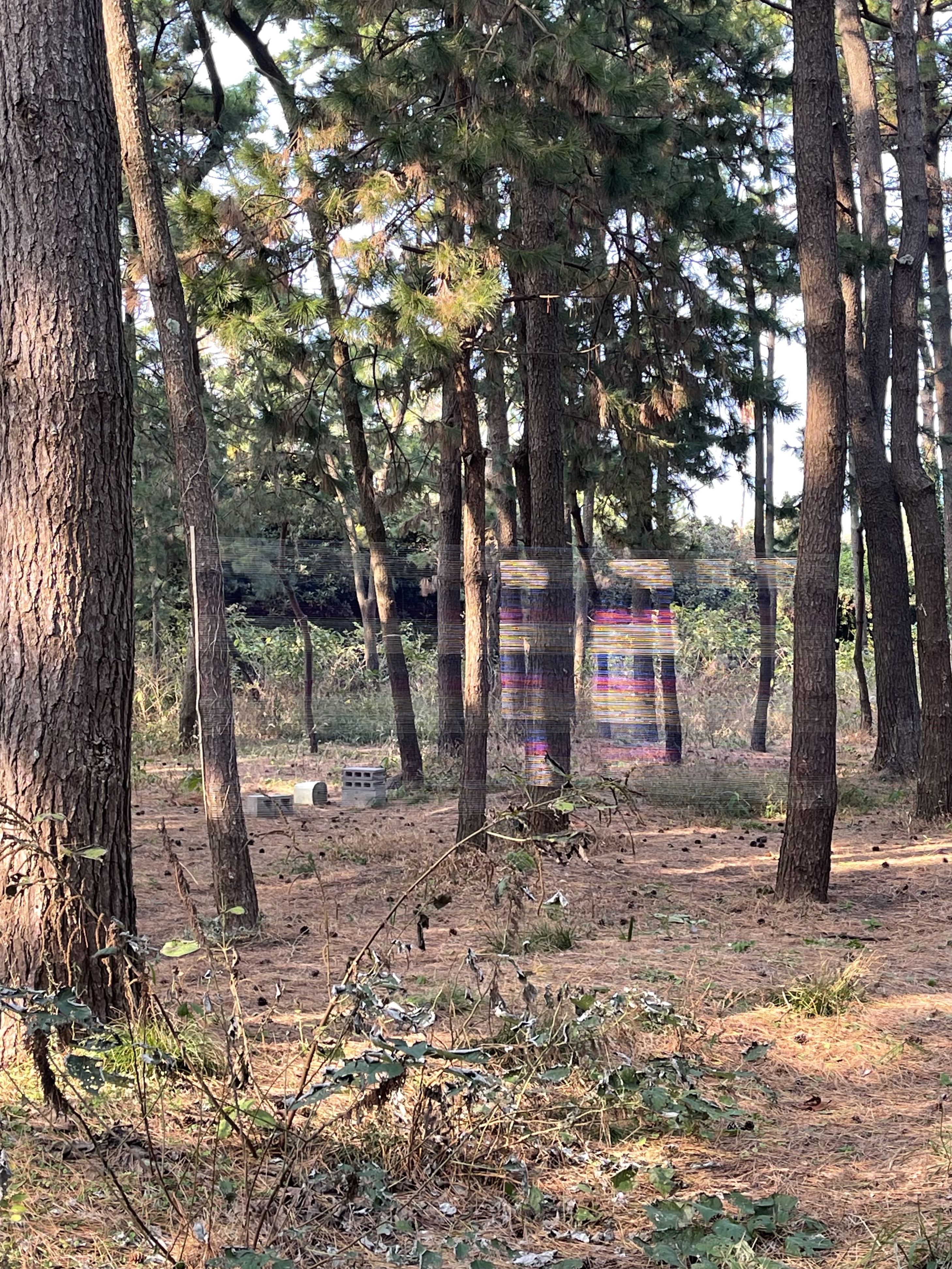 현재 금능 해변 솔밭에 설치된 <줄무늬 집>은 삼성혈에 설치했던 <움직이는 정원>작업에서 사용했던 명주실을 작업 철수 과정에서 온전히 되감아 보관했던 것들이다. <움직이는 정원>은 수고 10m를 넘나드는 나무들을 명주실로 감싸 둘렀던 총 5개의 거대한 설치 작업이었다. 전시 철수 시점 되감아 수거한 핑크, 블루, 퇴색한 흰색실은 <줄무늬 집>의 패턴이 되었다. 이 줄무늬는 비닐천막의 익숙한 3색선이다.