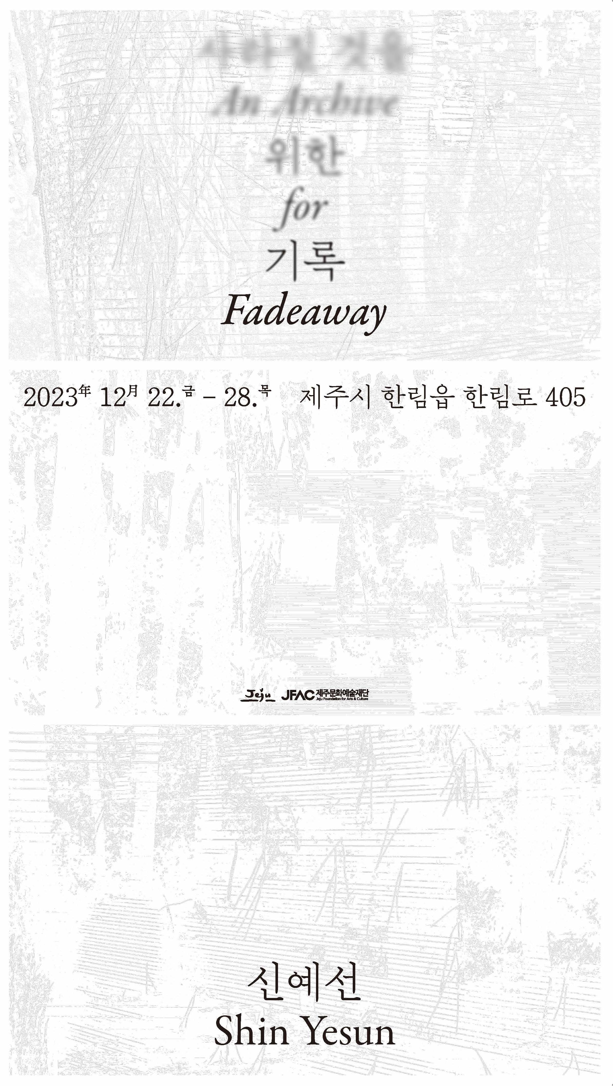 한림리 405 집은 수년간 비어 있던 공간이다. 나의 작업처럼 언젠가 없어질 이 공간에서 이곳의 격자문살, 벽장 문에 새겨진 꽃무늬 패턴들, 담벼락의 작은 물결 무늬들도 응시한다. 없어질 작업의 아름다운 미래와 기억만 가진 장소가 교차하는 기록의 필요를 전시를 통해 담는다.