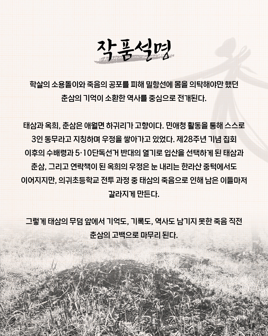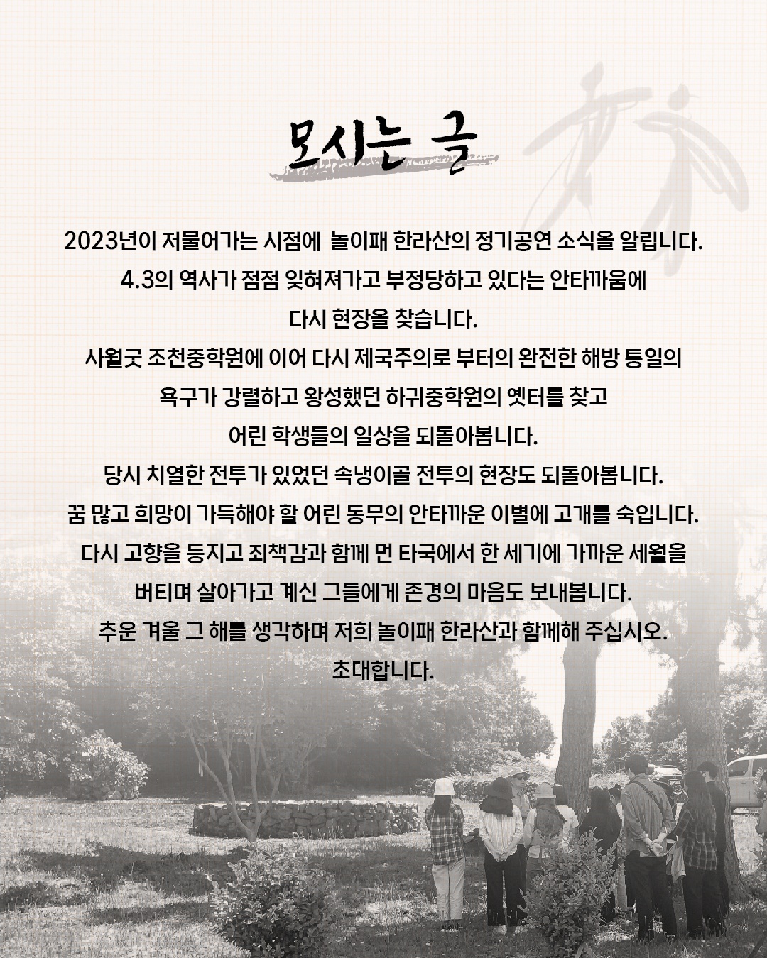 추운 겨울 그 해를 생각하며 저희 놀이패 한라산과 함께해 주십시오.