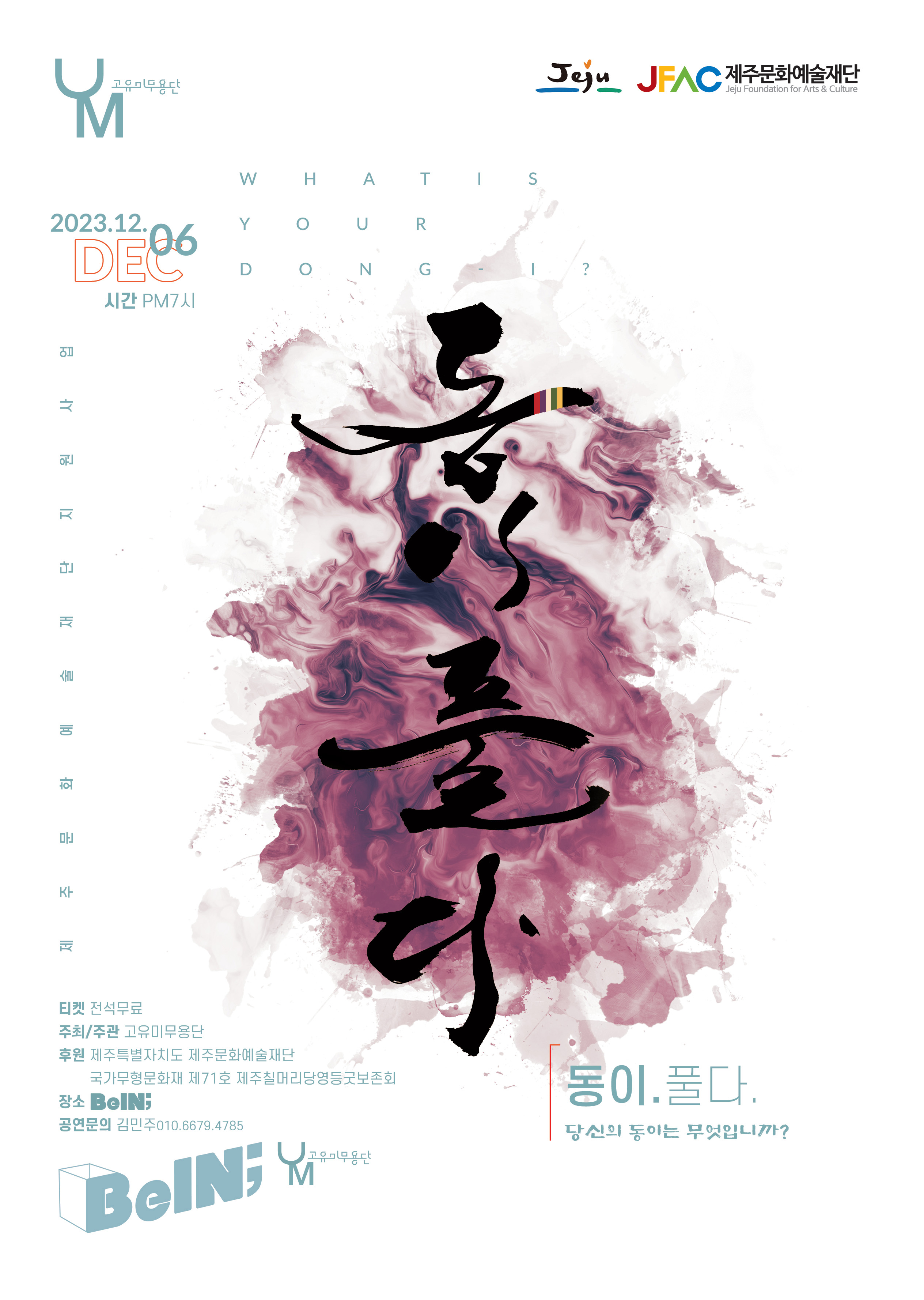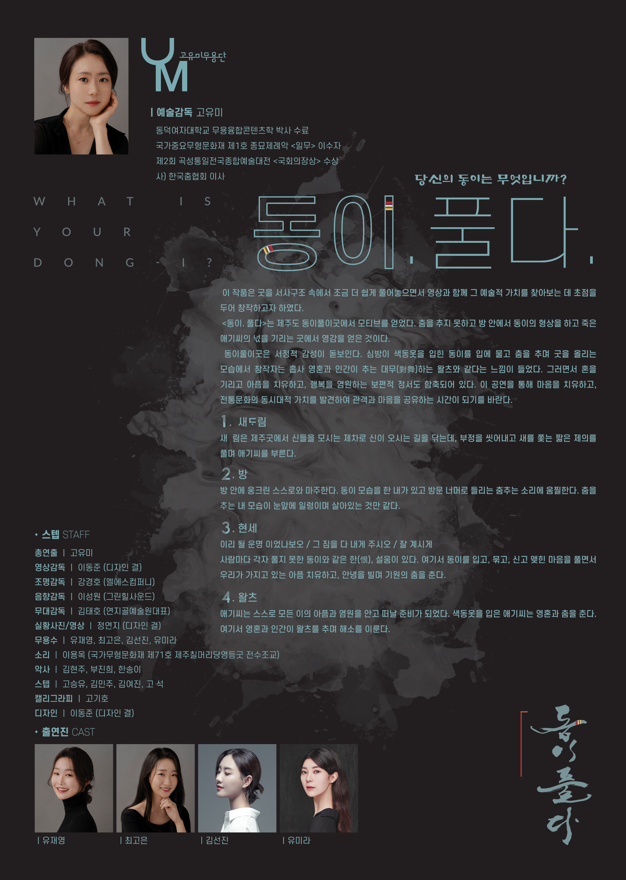 공연설명: 과거 굿이 마음을 치유하고 안정을 찾는 수단으로 사용되었듯 현시대의 키워드인 힐링이 이번 공연을 통해 현장에 공유되고 느껴지길 바라면서 춤과 미디어아트의 결합으로 이루어진 작품.
