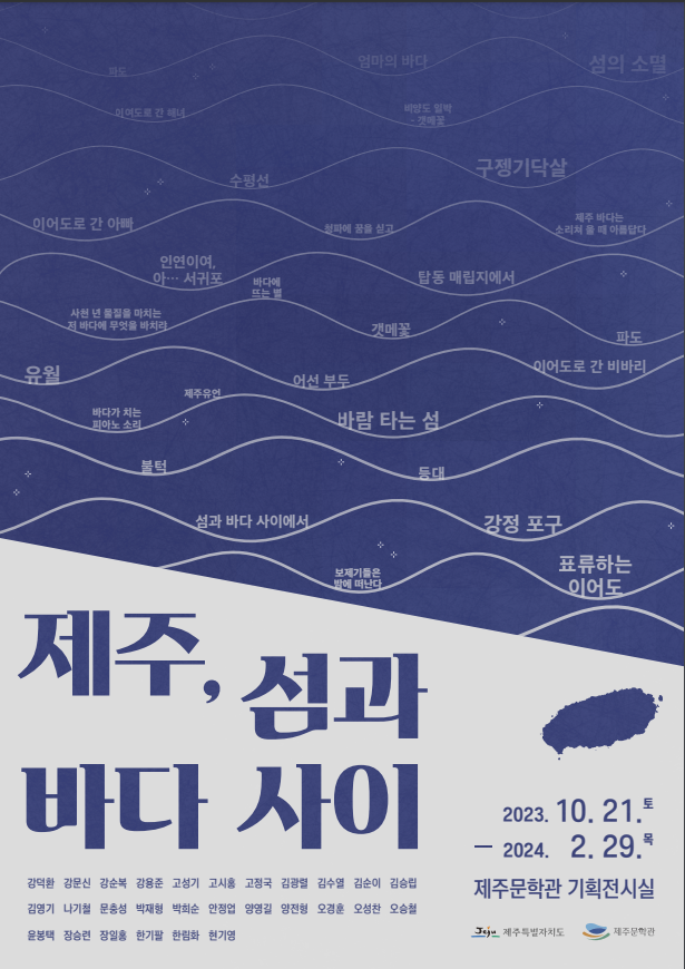 제주바다는 제주문학의 소재로서 제주인의 서정, 역사, 삶 등 다양한 주제로 변모되며, 각 장르별 문학적 의미가 다양하게 나타납니다. 이 전시를 통해 제주바다가 제주문학에 미친 영향을 확인하는 계기가 되길 바랍니다.