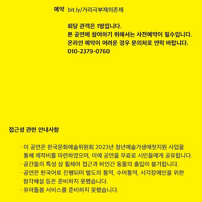 ✅ 본 공연에 참여하기 위해서는 사전예약이 필수입니다. 온라인 예약이 어려운 경우에는 문의처로 연락 바랍니다.
