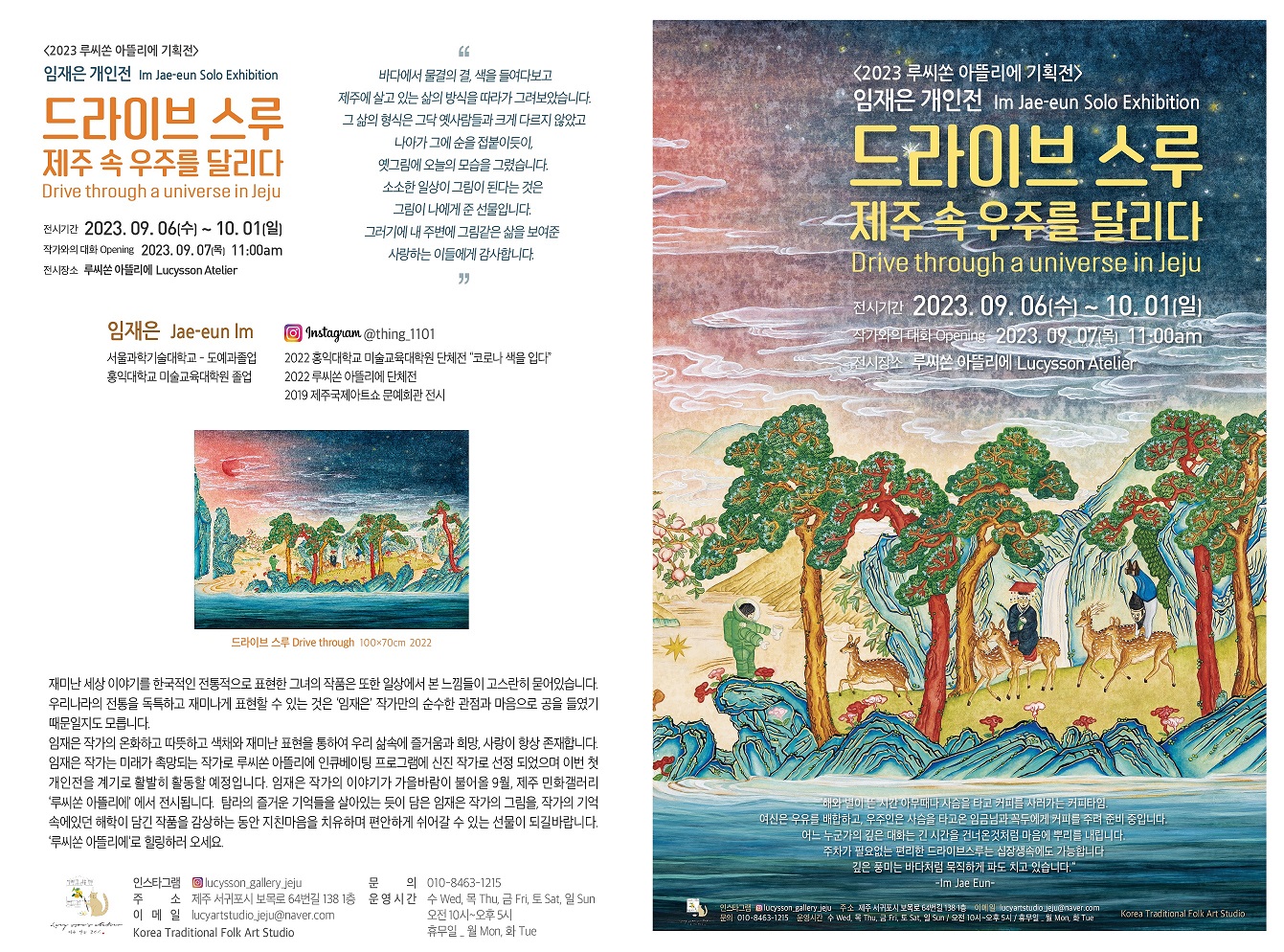 10월 말, 할로윈이 찾아옵니다. 할로윈데이는 고대 달력에서 맞이할 새해의 전날을 위한 축제라고 합니다.이렇게 귀한 커피한잔을 ‘루씨쏜아뜰리에’로 오셔서 임재은 작가님의 재미난 작품과 함께 지난 시간들을 회고하고,앞으로 올 설레이는 시간들을 생각해보아요.임재은 작가의 온화하고 따뜻하고 색채와 재미난 표현을 통하여 우리 삶속에 즐거움과 희망, 사랑이 항상 존재합니다. 임재은 작가는 미래가 촉망되는 작가로 루씨쏜 아뜰리에 인큐베이팅 프로그램에 신진 작가로 선정 되었으며 이번 첫 개인전을 계기로 활발히 활동할 예정입니다. 임재은작가의 이야기가 가을바람이 불어올 9월, 제주 민화갤러리‘루씨쏜 아뜰리에’ 에서 전시됩니다. 탐라의 즐거운 기억들을 살아있는 듯이 담은 임재은 작가의 작품을 감상하는동안 지친마음을 치유하며 편안하게 쉬어갈 수 있는 선물이 되길바랍니다. ‘루씨쏜 아뜰리에‘로 힐링하러 오세요.