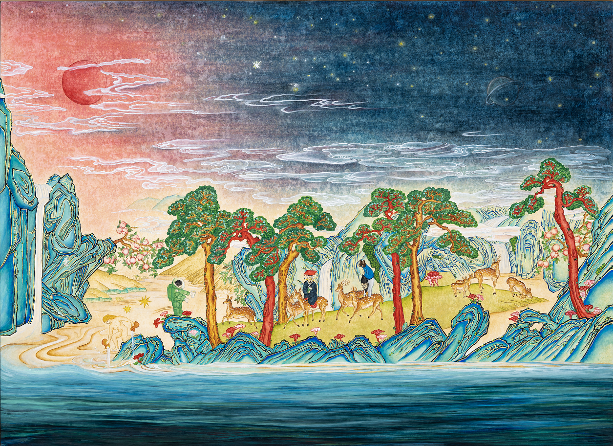 세상이 열린 후 하늘에서 천지왕과 여신들이 내려와 지구에서 커피와 산수를 즐깁니다. 우리가 감사함을 잊고 쉽게 접하던 커피한잔이 지구 밖에서는 우주 저머로 가는일보다 힘들다고 합니다. 열심히 어지럽게 지나간 시간들을 달려온 우주인들은 커피가 가장 마시고 싶었다고 합니다. 이렇게 재미난 세상 이야기를 한국적인 전통적으로 표현한 그녀의 작품은 또한 일상에서 본 느낌들이 고스란히묻어있습니다. 작가는 한국화 속에 우리의 일상적인 시간들을 현대적으로 표현하였습니다. 우리나라의 전통을 독특하고 재미나게 표현할 수 있는 것은 ‘임재은’ 작가만의 순수한 관점과 마음으로 공을 들였기 때문일지도 모릅니다.