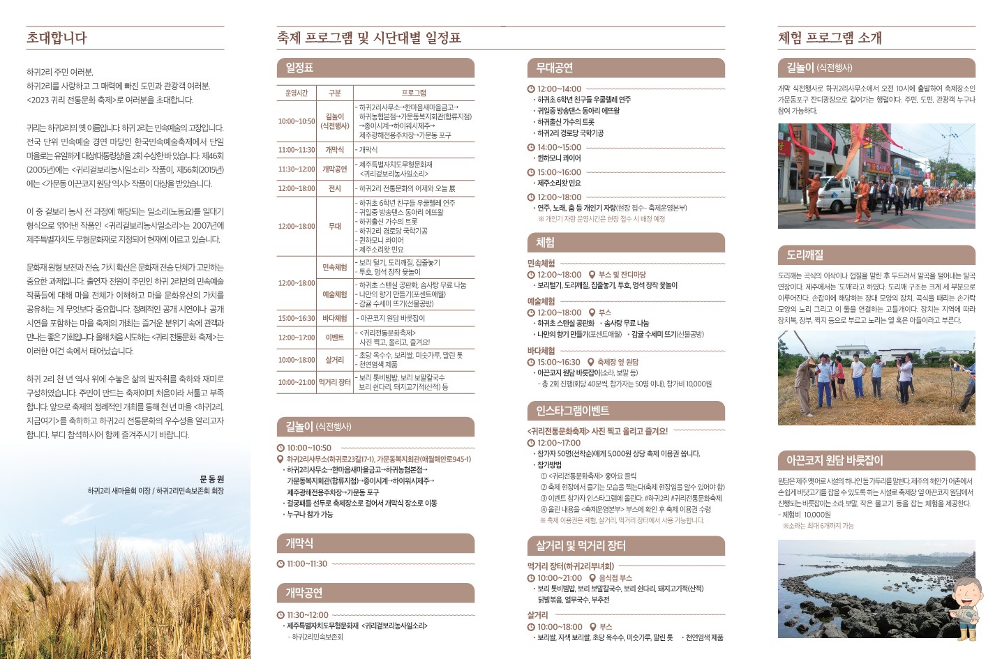 ▸ 체험 : 보리털기, 도리깨질등 민속체험, 원담바릇잡이 체험, 스텐실 공판화, 나만의 향기 만들기, 감귤 수세미 뜨기