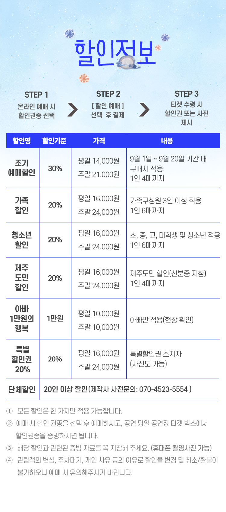 수 16:00 목 16:00, 19:00 금 15:00 토 11:00, 15:00, 17:30 일 11:00, 15:00