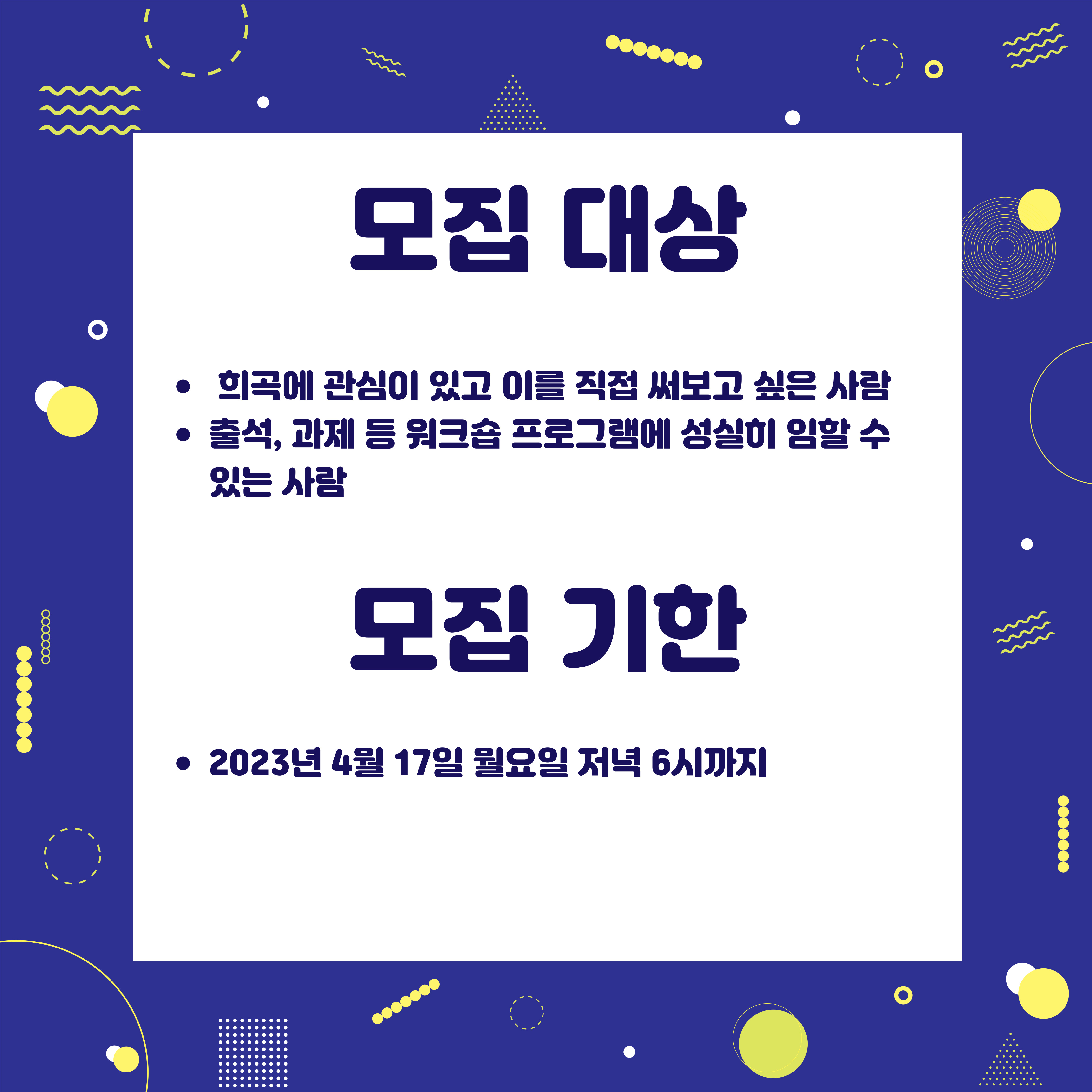 - 모집 대상: 희곡에 관심이 있고 이를 써보고 싶은 사람이면 누구나 참여 가능합니다. 단, 출석, 과제 등 워크숍 프로그램에 성실히 임할 수 있어야 합니다.