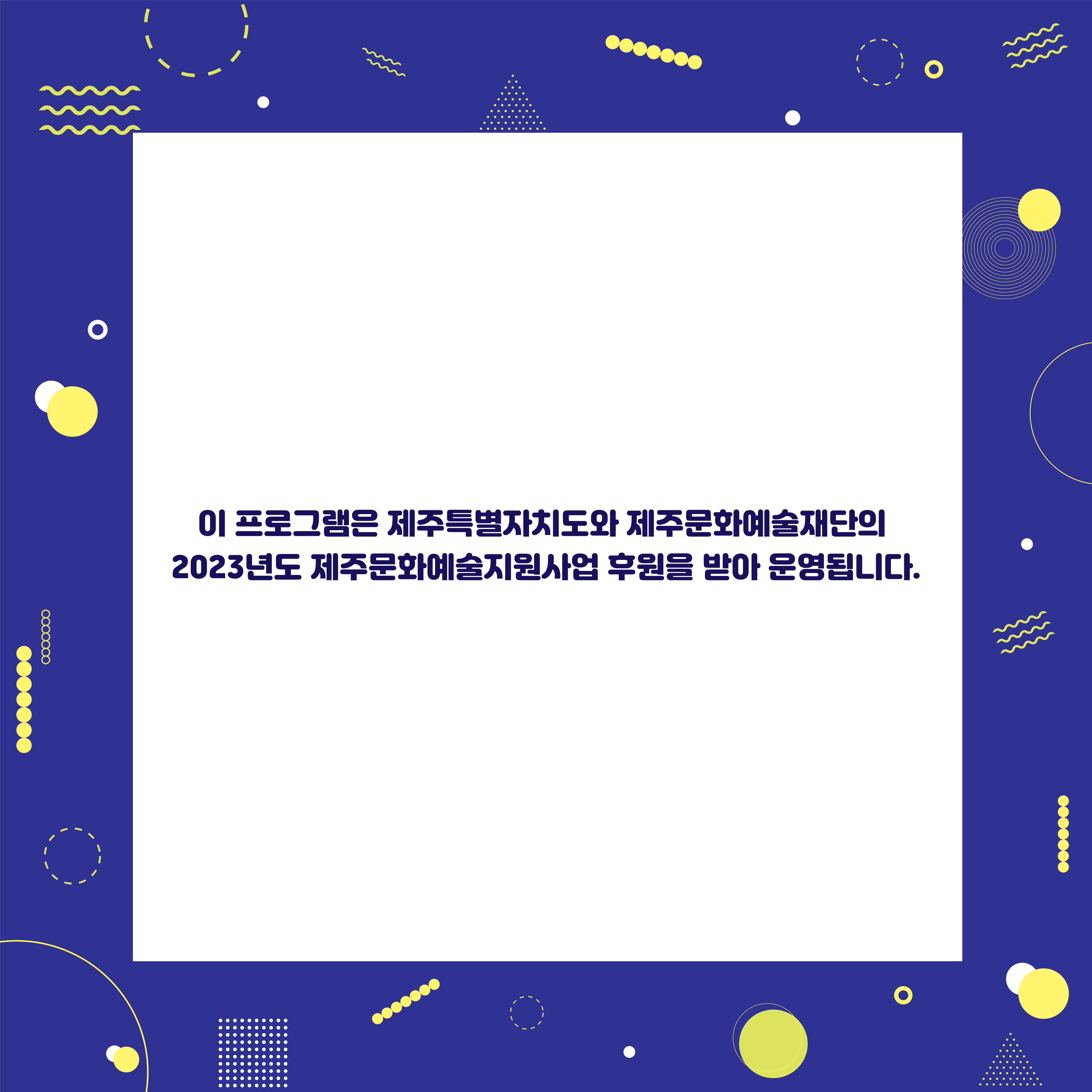 * 이 프로그램은 제주특별자치도와 제주문화예술재단의 2023년도 제주문화예술지원사업 후원을 받아 운영됩니다.