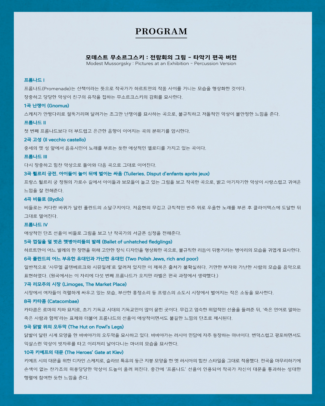 타악기의 다채로운 소리로 곡의 장면들을 생생하게 느껴보세요.
