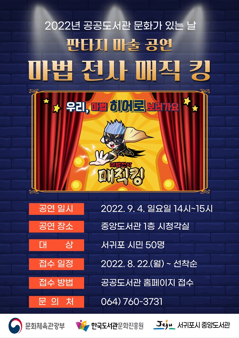 중앙도서관은 2022년 공공도서관 문화가 있는 날"마법전사 매직킹" 판타지 마술 공연 참가자를 모집합니다.