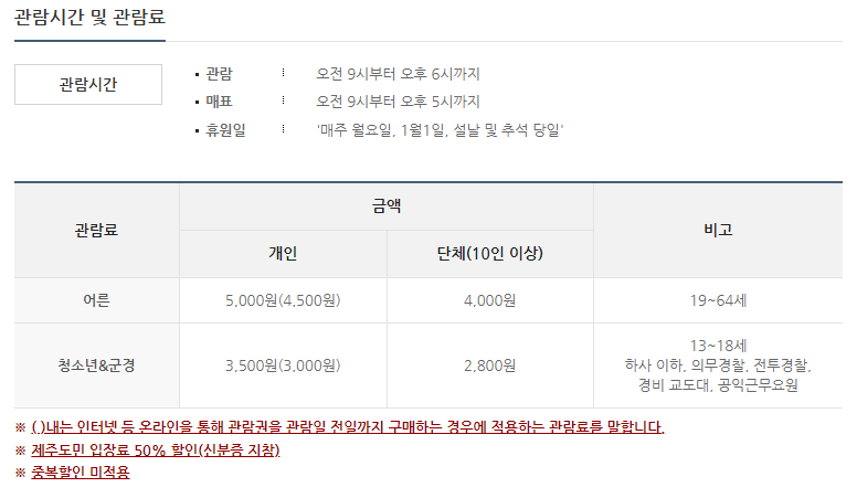 휴관일 : 매주 월요일, 1월 1일, 설날 및 추석 당일