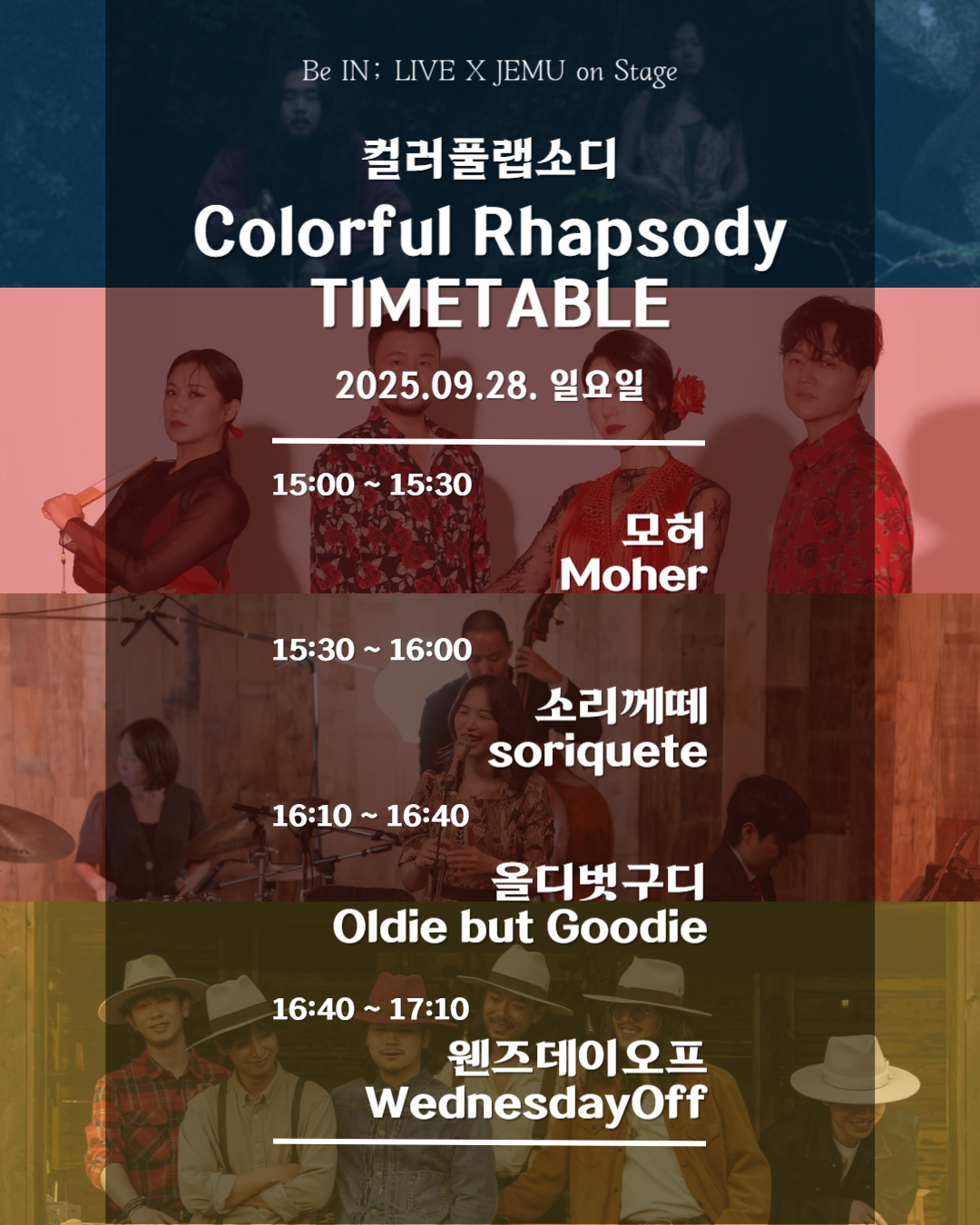 모허(Moher), 소리께떼(Soriquete), 올디벗구디(Oldie but goodie), 웬즈데이오프(Wednesday off)가 참여해, 각자의 음악적 개성과 색깔을 무대 위에 펼쳐 보입니다.