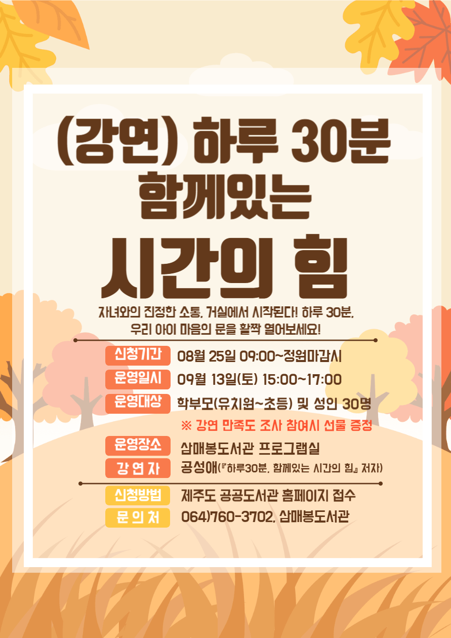 [삼매봉도서관] 하루 30분, 함께있는 시간의 힘 강연 참가자 모집 안내