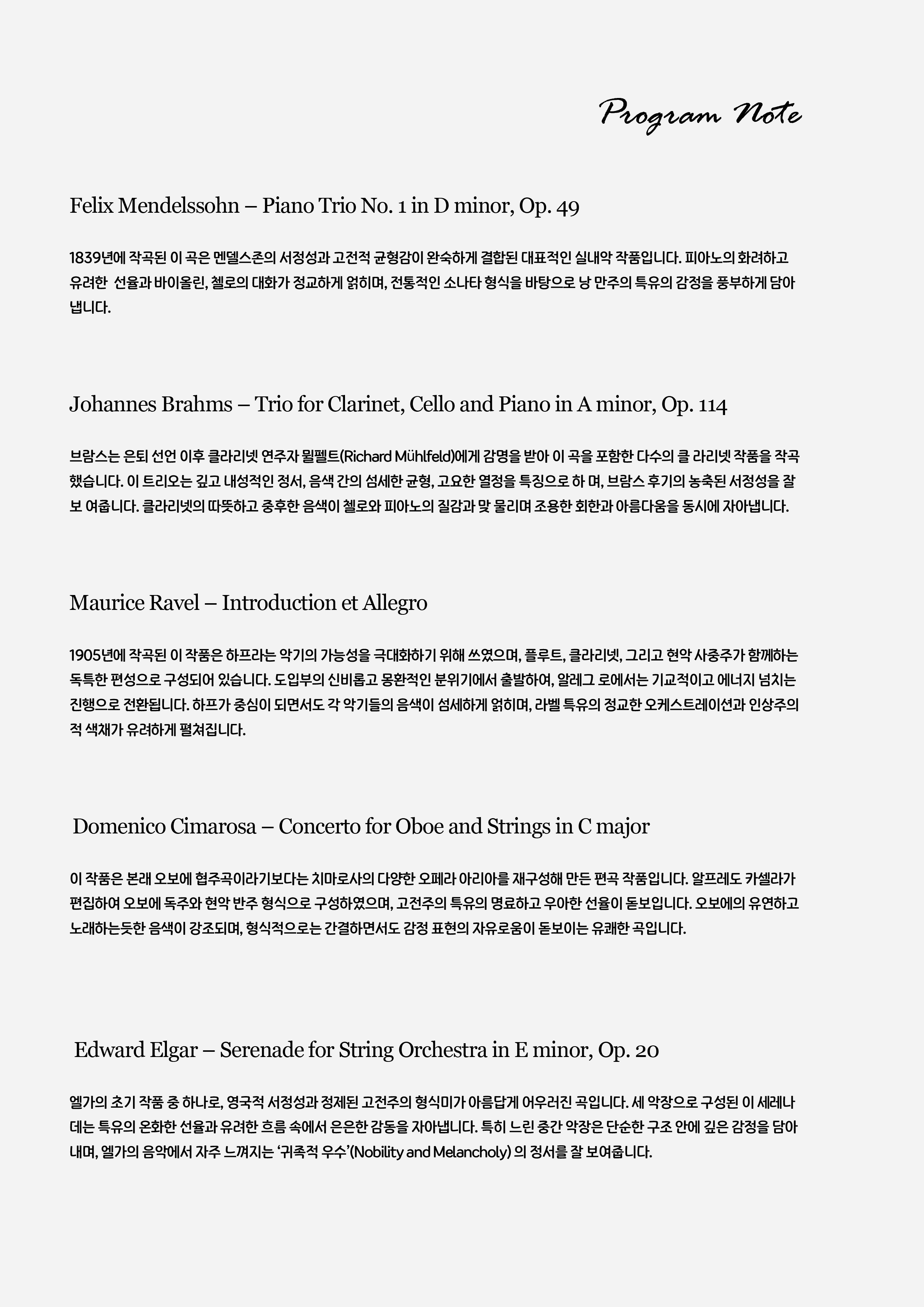 프로그램에는 멘델스존의 피아노 트리오와 브람스의 클라리넷 트리오, 라벨의 서주와 알레그로, 치마로사의 오보에 협주곡 C장조, 그리고 엘가의 현을 위한 세레나데가 포함돼 있다. 특히 이번 무대에는 오보에 현신웅이 협연자로 나선다.