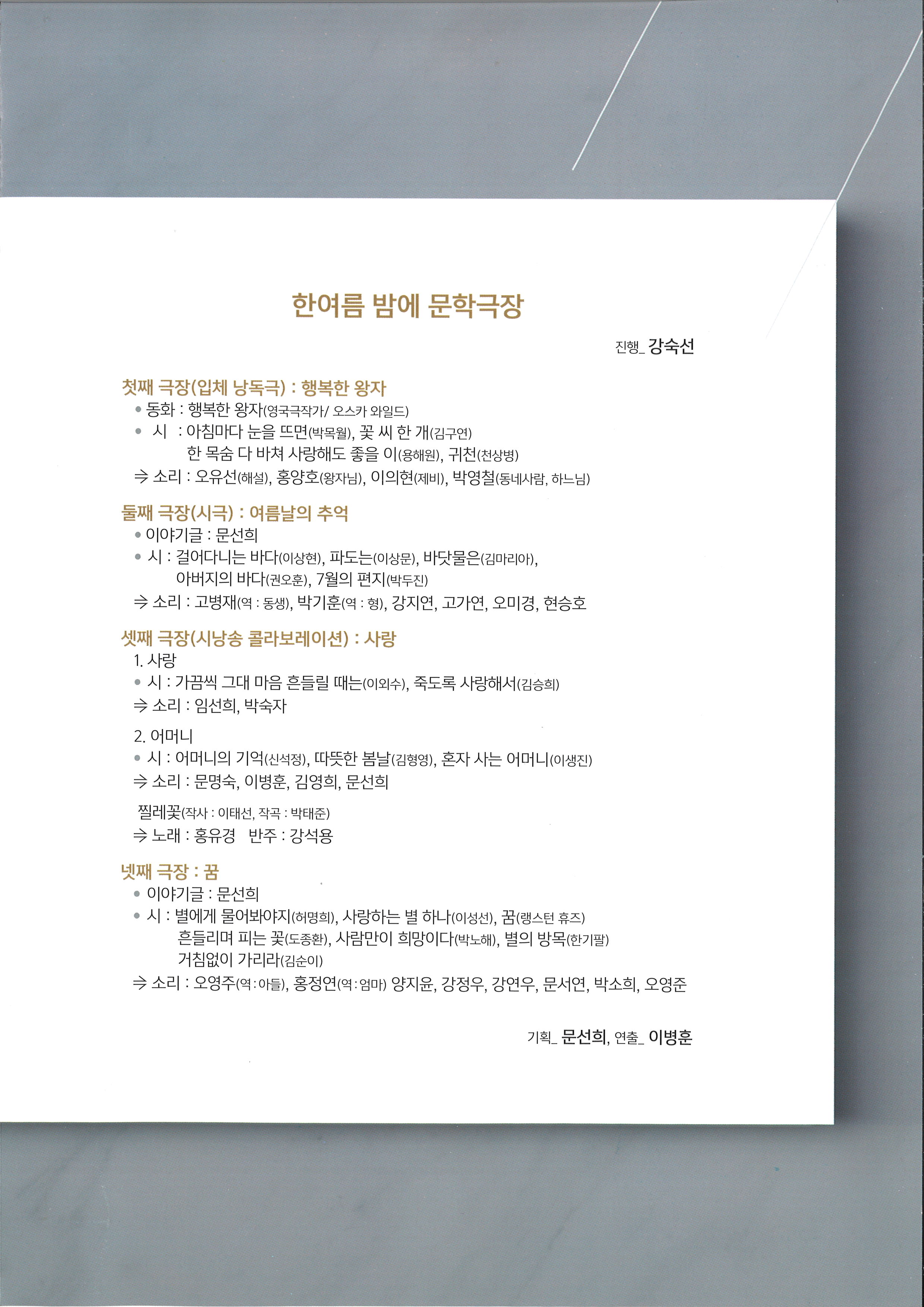 작품의 낭독으로 직접 체험하여 세대들의 삶, 사랑, 지난날의 이야기 등을 함께하는 교감 속에
