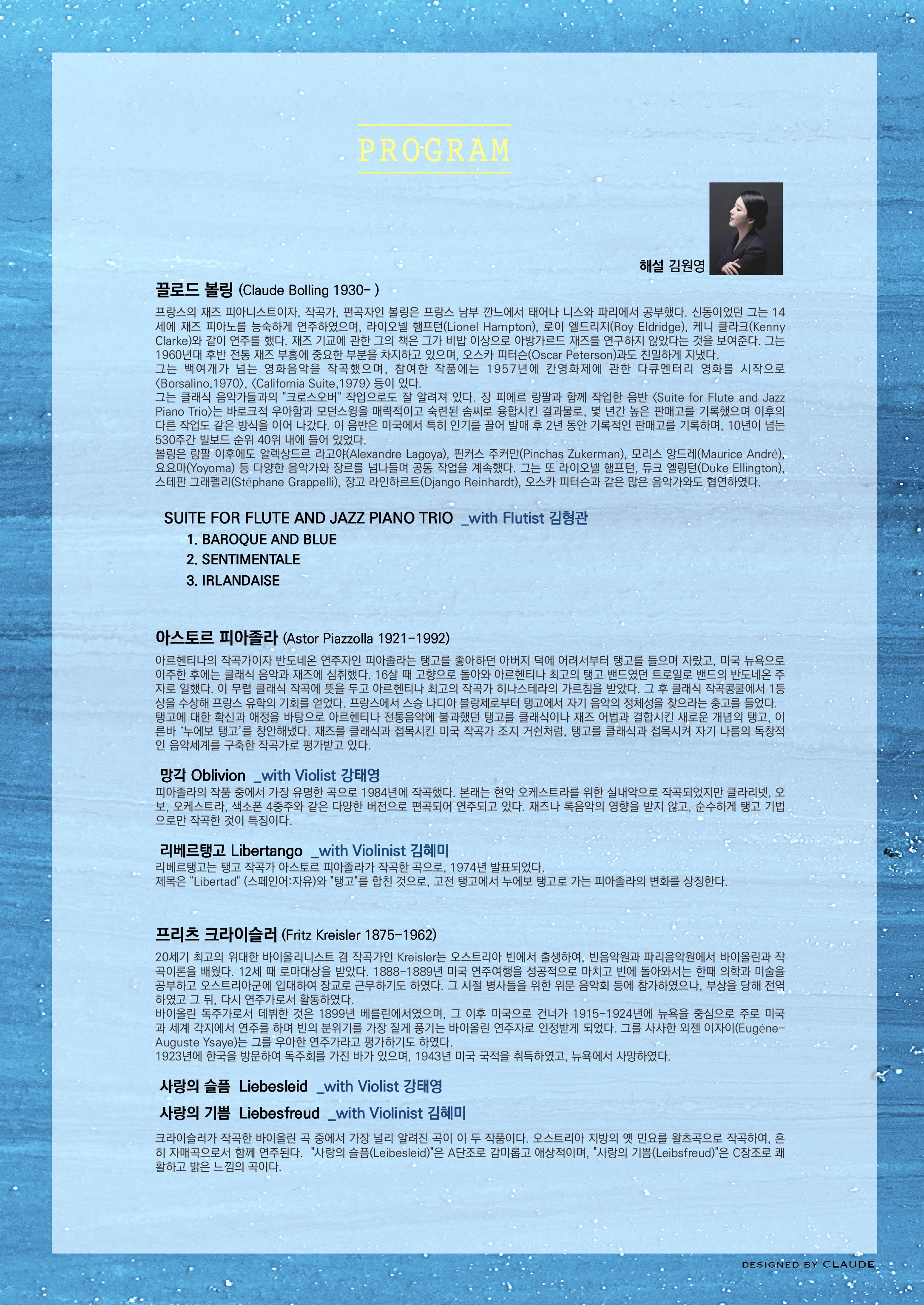 누구나 아는 또 하나의 피아졸라의 명곡, '리베르탱고' (Libertango), 크라이슬러의 화려한 바이올린 소품곡 '사랑의 기쁨' (Liebesfreud)이 재즈화성&리듬으로 새롭게 변신합니다.
