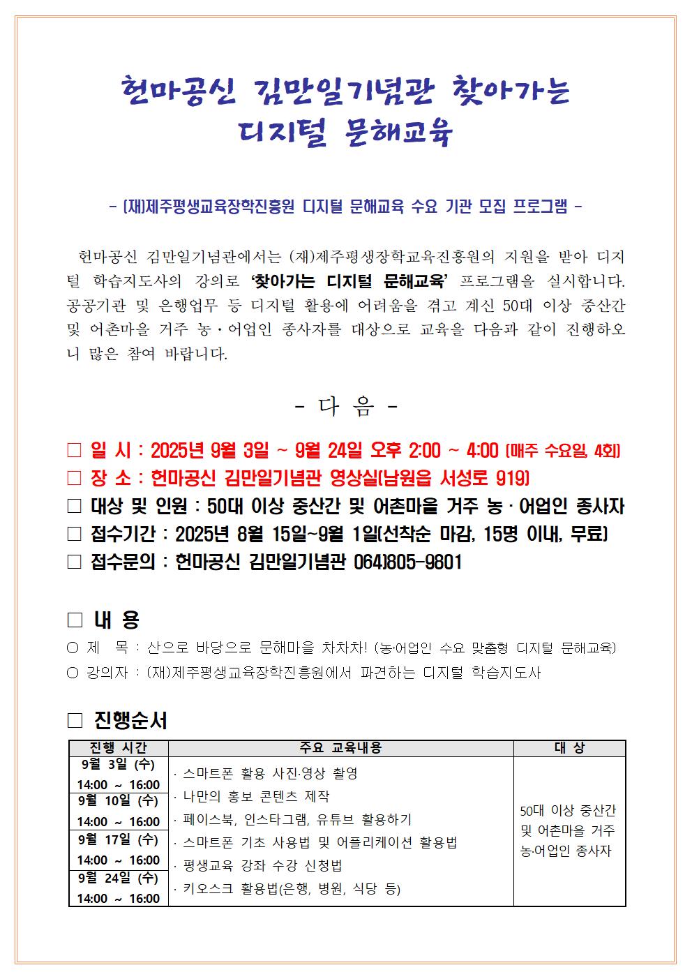 헌마공신 김만일기념관에서는 (재)제주평생장학교육진흥원의 지원을 받아 디지털 학습지도사의 강의로‘찾아가는 디지털 문해교육’프로그램을 실시합니다. 공공기관 및 은행업무 등 디지털 활용에 어려움을 겪고 계신 50대 이상 중산간 및 어촌마을 거주 농·어업인 종사자를 대상으로 교육을 다음과 같이 진행하오니 많은 참여 바랍니다.