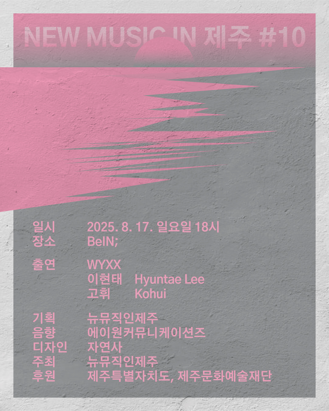 ‘NEW MUSIC IN 제주’ 열 번째 시리즈에서는 WYXX, 이현태, 고휘 세 명의 아티스트를 초청하여, 소리와 이미지, 알고리즘의 복합적 관계를 탐구하는 음악적·시청각적 실험의 장을 마련합니다. 각 아티스트의 고유한 작업 세계를 통해, 예측 가능성과 불가능성, 질서와 무질서의 경계에서 발생하는 새로운 감각의 가능성을 제시 합니다.