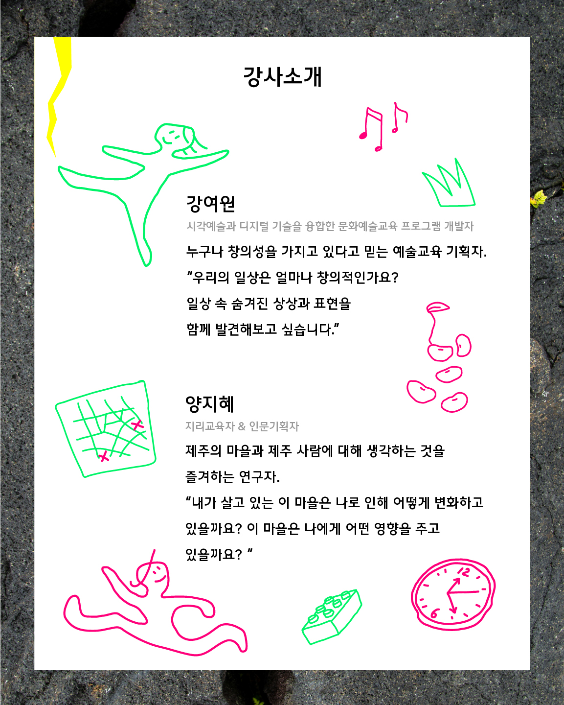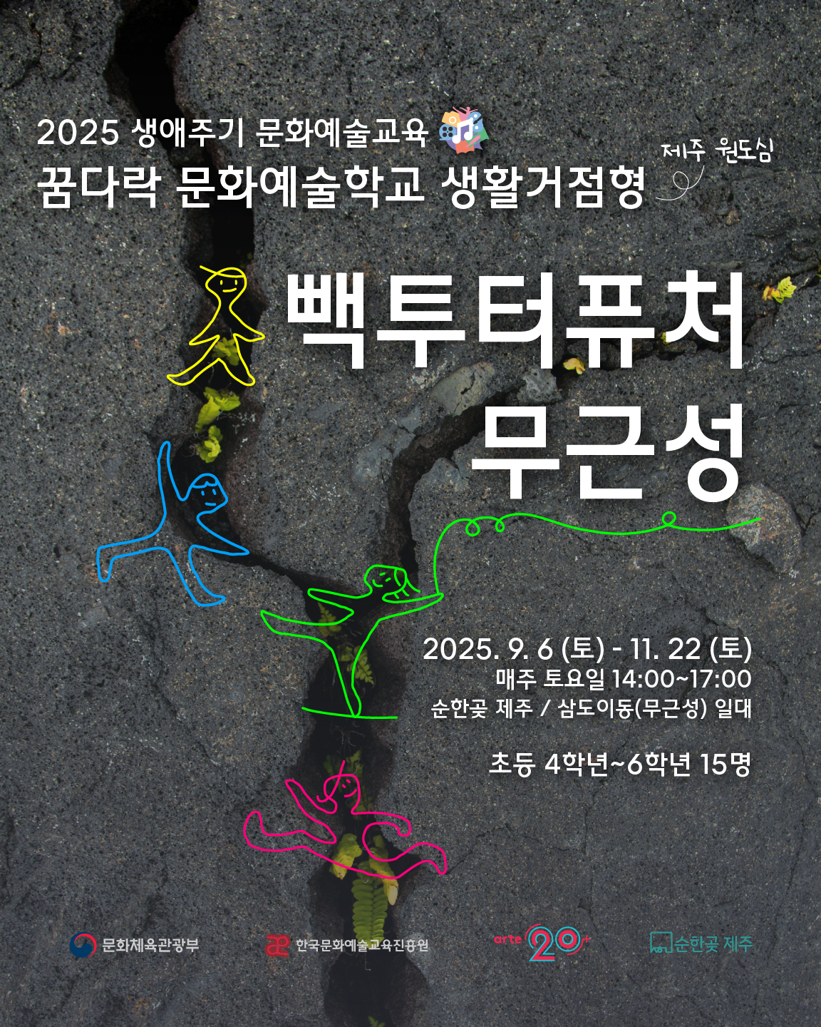 [2025 생애주기문화예술교육 ‘꿈다락 문화예술학교’ 제주시 생활거점]은 제주시 원도심에 관심과 애정을 가진, 또 원도심에서 활동하는 예술가, 예술교육가, 기획자, 활동가, 예술공간, 단체와 함께 합니다.