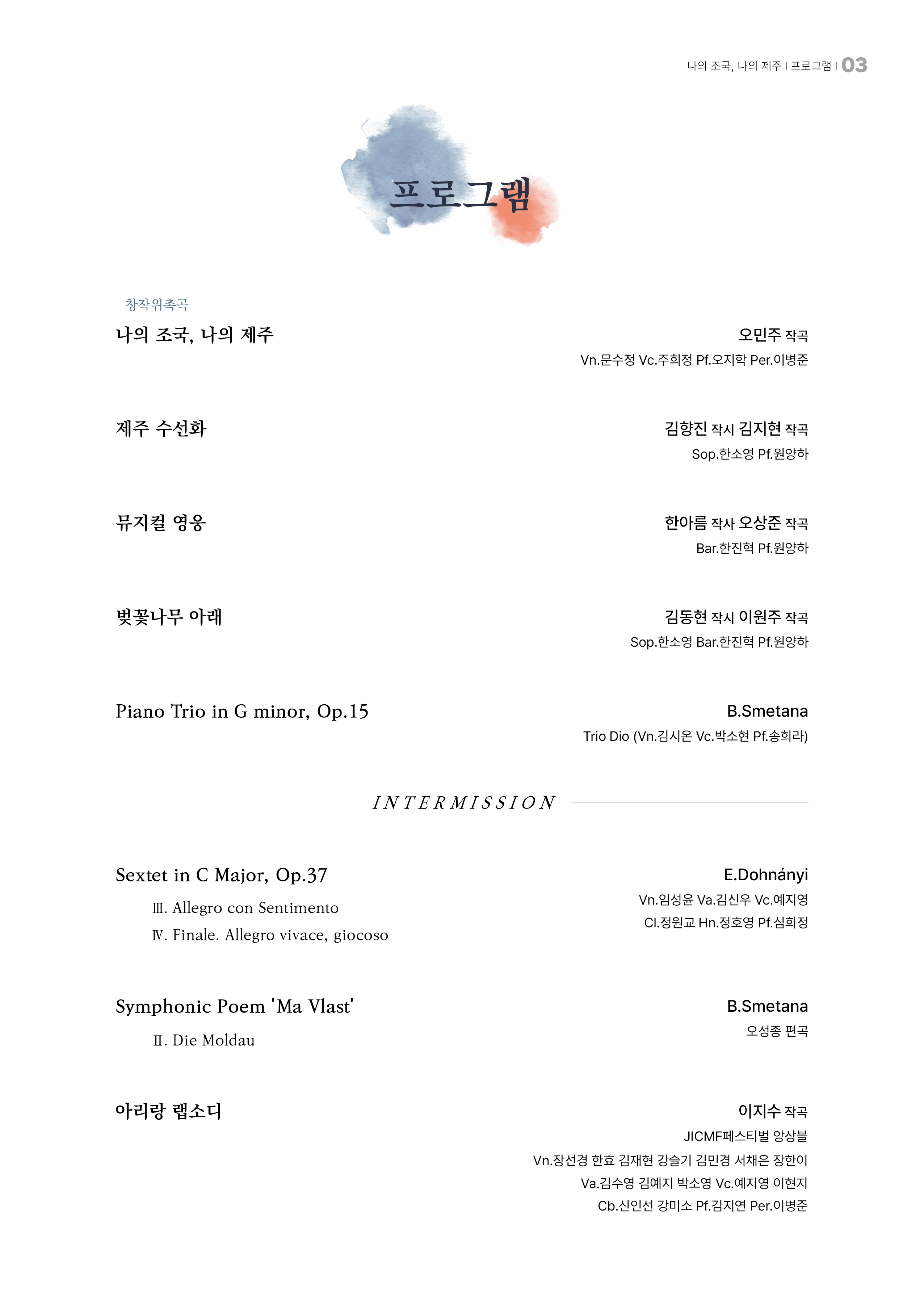 제주 출신 작곡가 오민주의 창작 위촉곡 "나의 조국, 나의 제주"를 비롯해, 제주의 자연을 노래한 가곡과 뮤지컬 영웅, 스메타나의 교향시 몰다우, 도흐나니의 6중주, 이지수의 아리랑 랩소디 등 다채로운 작품들이 무대에 오른다.