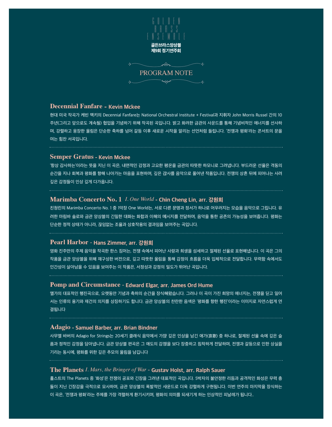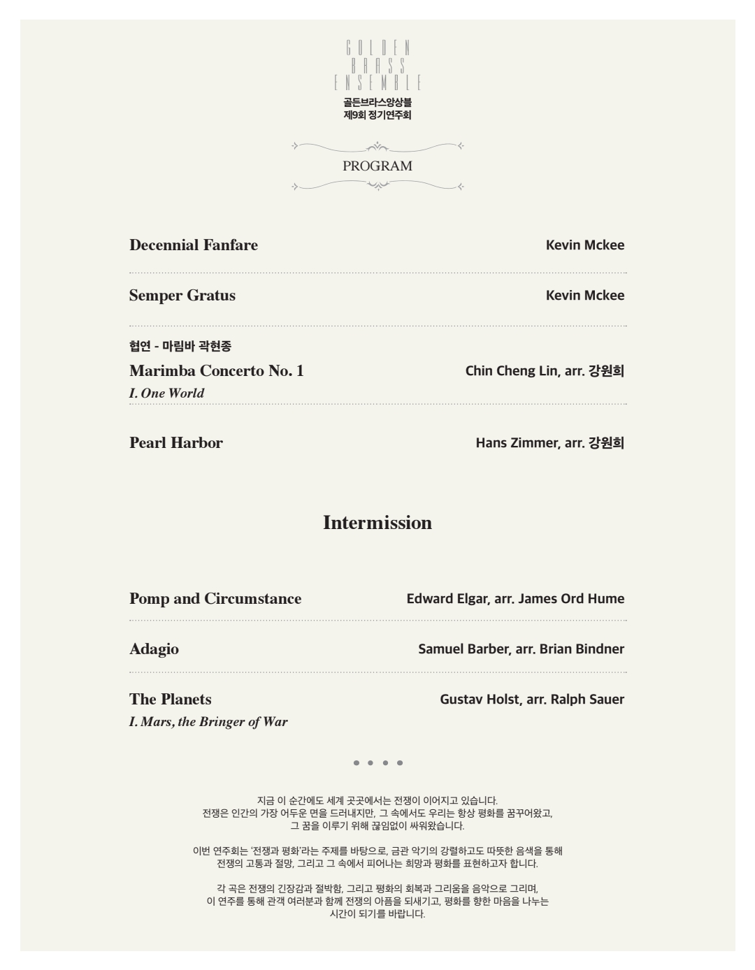 각 곡은 전쟁의 긴장감과 절박함, 그리고 평화의 회복과 그리움을 음악으로 그리며, 이 연주를 통해 관객 여러분과 함께 전쟁의 아픔을 되새기고, 평화를 향한 마음을 나누는 시간이 되기를 바랍니다.
