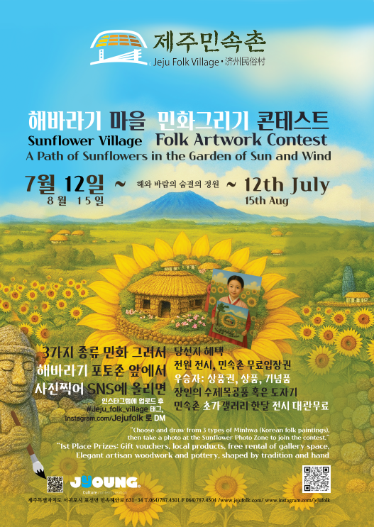 제주 서귀포시 제주민속촌에서는 오는 7월 12일(토)부터 8월까지 『해바라기 축제 & 민화그리기 콘테스트』를 개최한다.