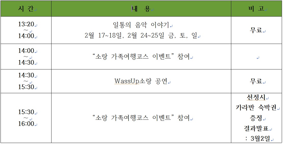 13:30~일통의 음악이야기, 14:30~WassUp소랑 무료 관람, 15:30~소랑가족여행코스 이벤트