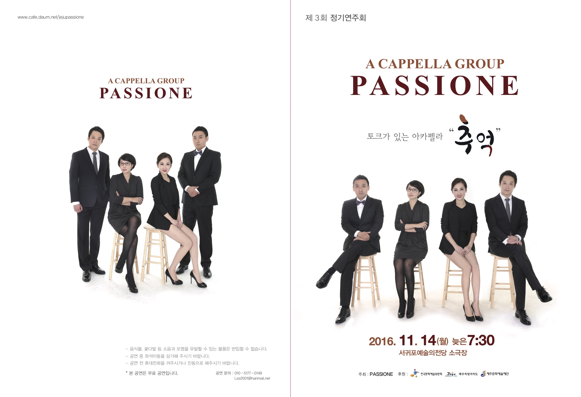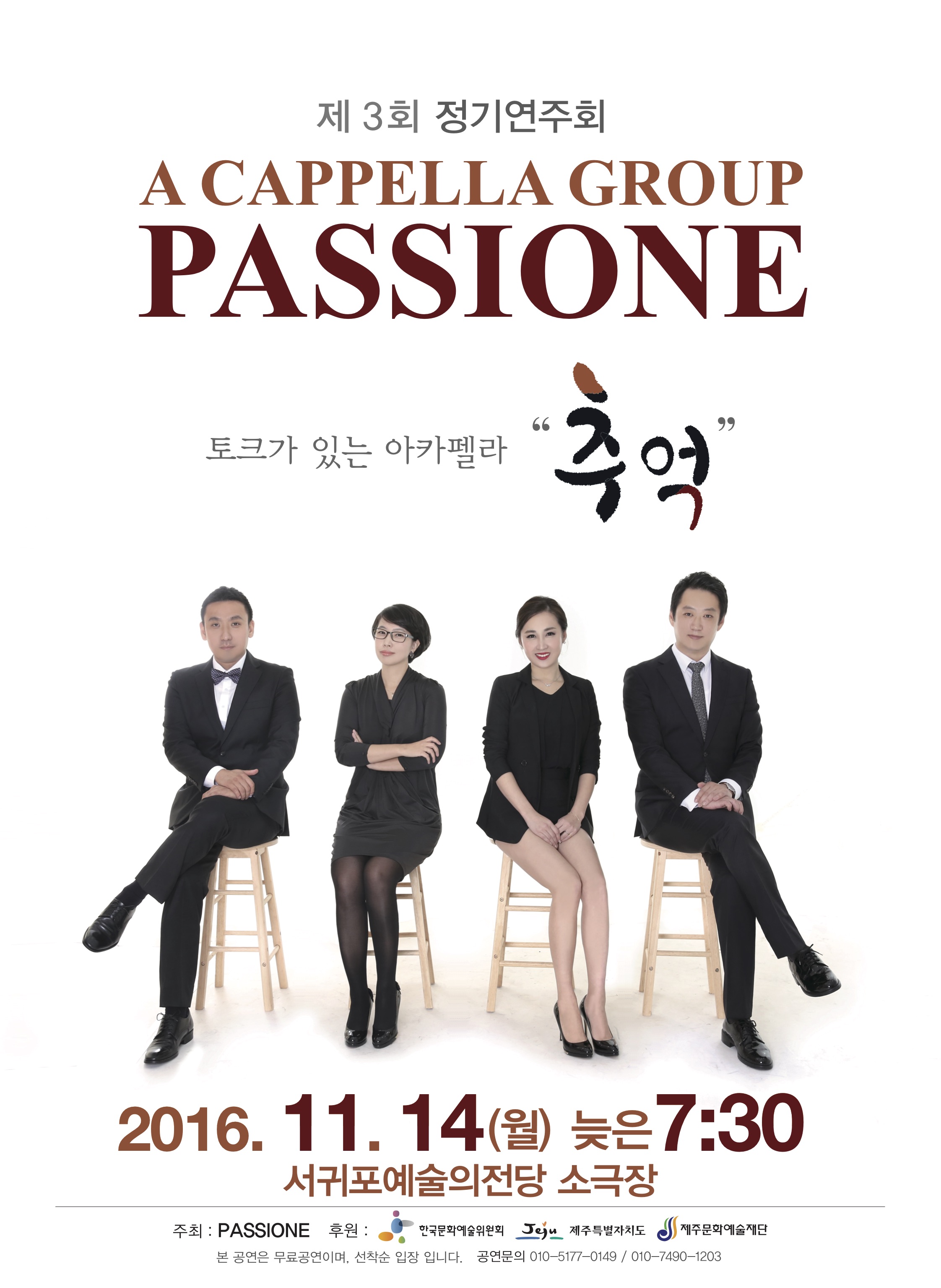 • 2016년 11월 14일 월요일 늦은 7시 30분에 서귀포예술의 전당 소극장에서 도내 유일의 아카펠라 그룹인 빠시오네가 "토크가 있는 아카펠라" 라는 주제를 가지고 공연을 합니다.